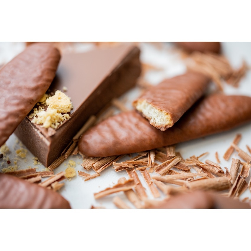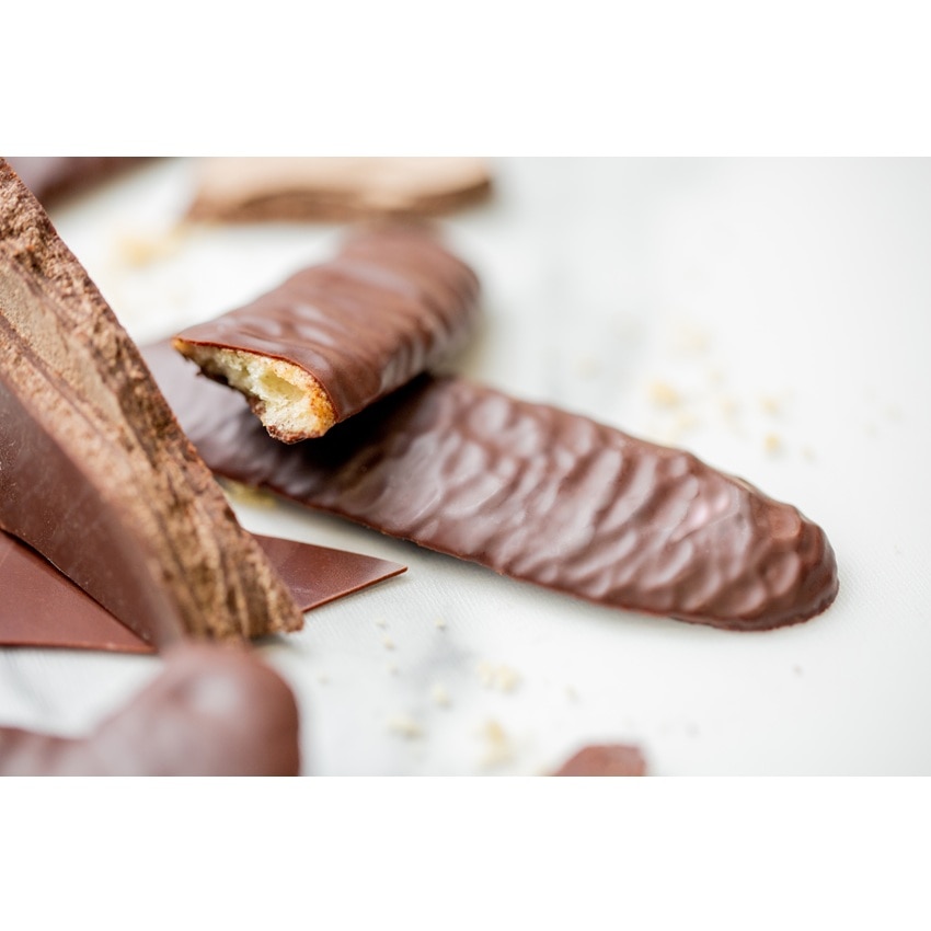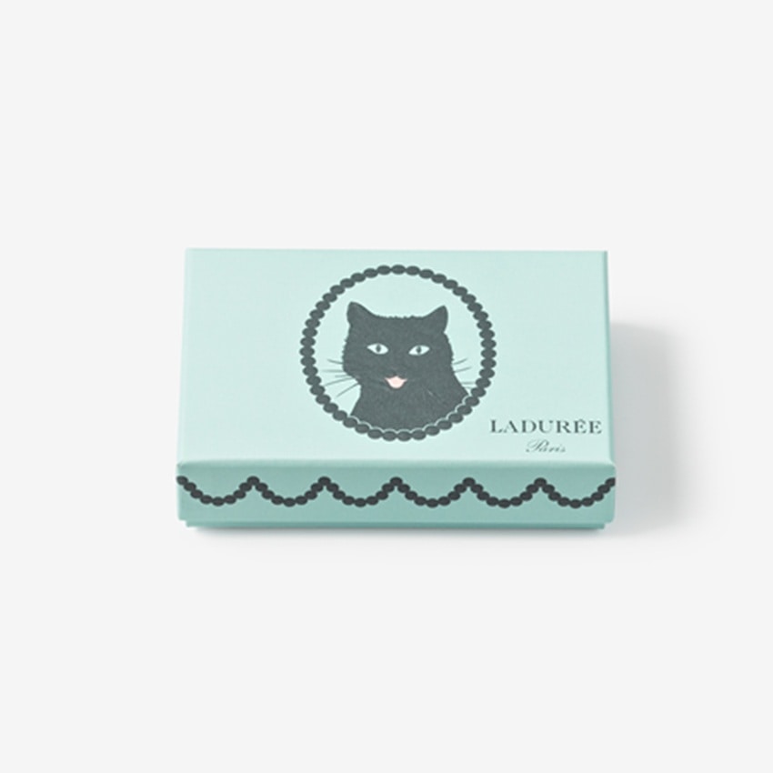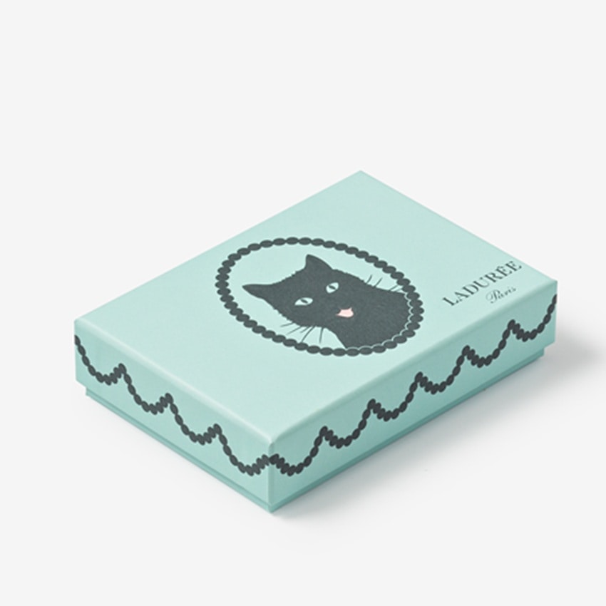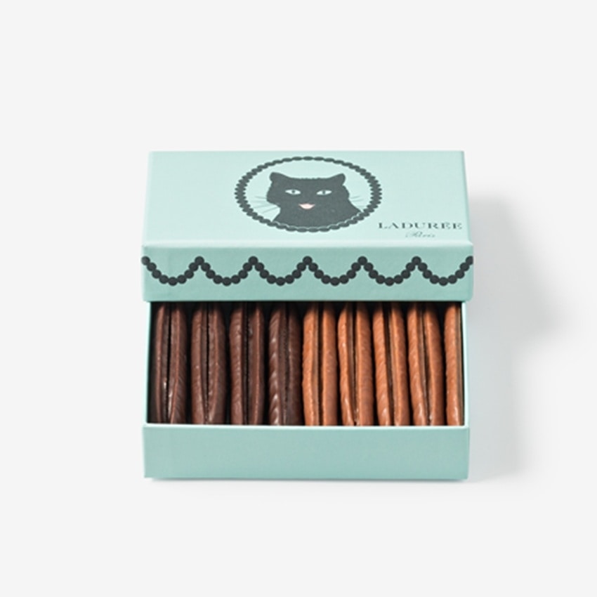 猫の舌を象ったサクサクのビスキュイをダークチョコレートとミルクチョコレートでコーティングし、可愛い黒猫が描かれたBOXに詰め合わせました。