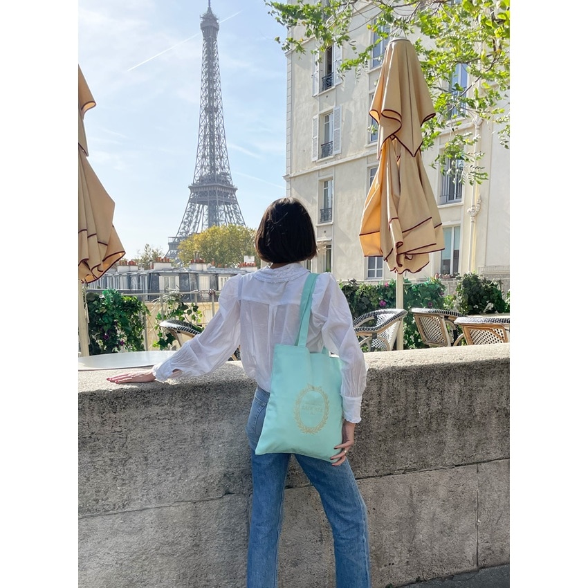 テ・マリー・アントワネットのマカロンのようなパステルブルーのトートバッグに、ラデュレのロゴをあしらいました。