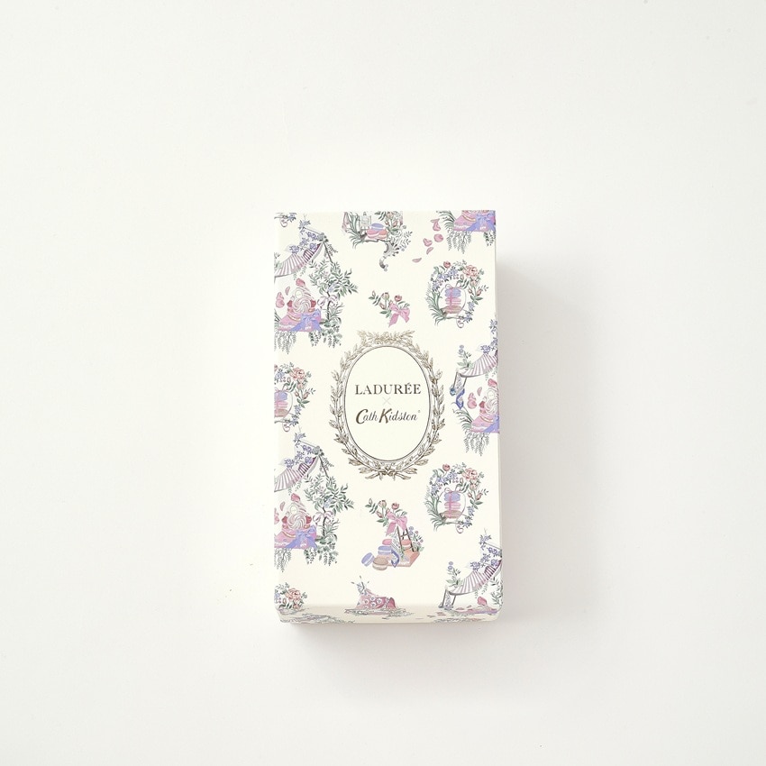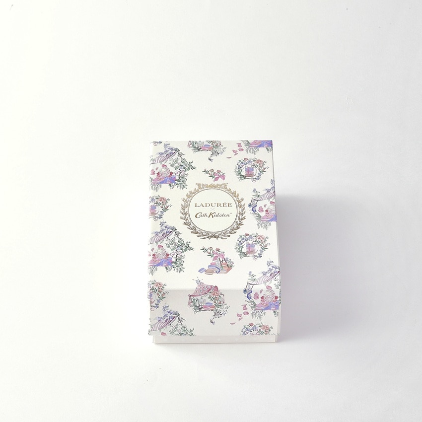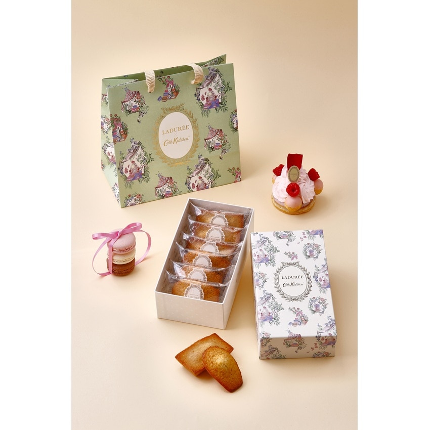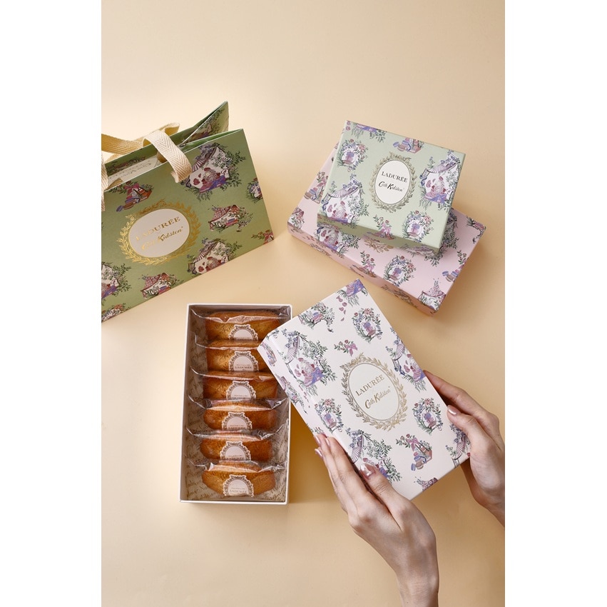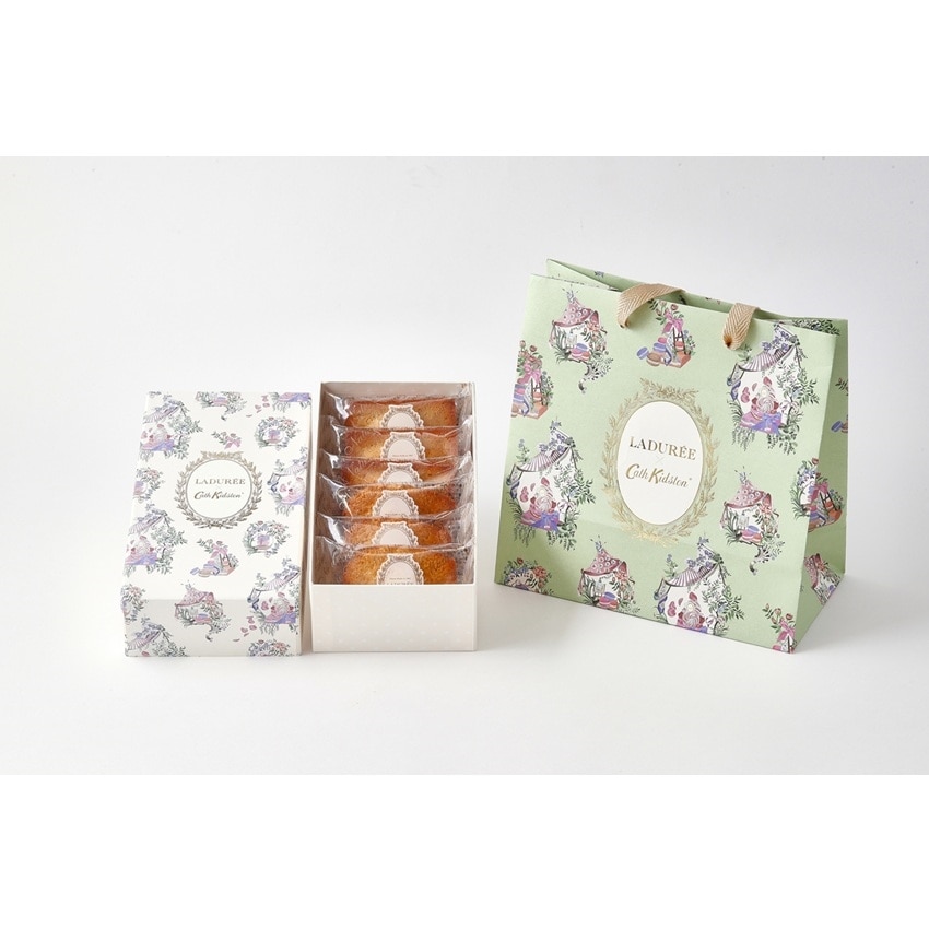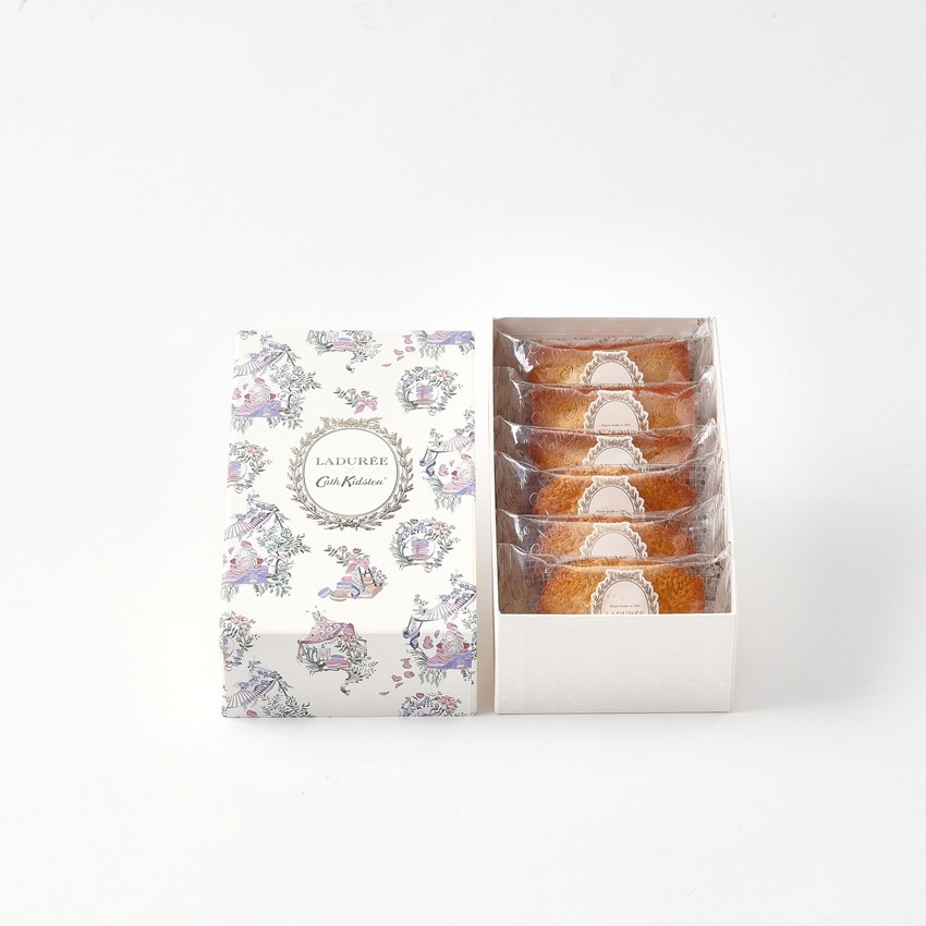 キャス キッドソンのヘッド・オブ・クリエイティブであるホリー・マーラーによって描かれた、美しく繊細なトワル・プリントが彩るアイボリーのボックスに、アーモンドの香ばしさと焦がしバターの風味が広がるフィナンシェ・ナチュールと、甘い香りと濃厚なフランス産発酵バターで外側はサクッ、中はしっとりとしたマドレーヌ・ナチュールの詰め合わせ。