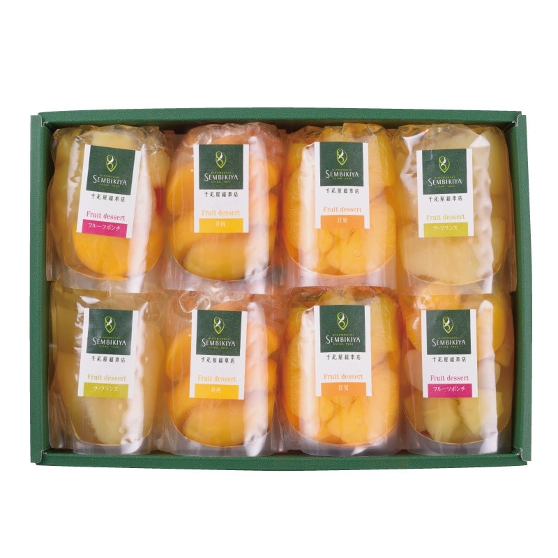 洋なし、甘夏、黄桃、フルーツポンチのいずれか8個を詰合せてお届け致します。