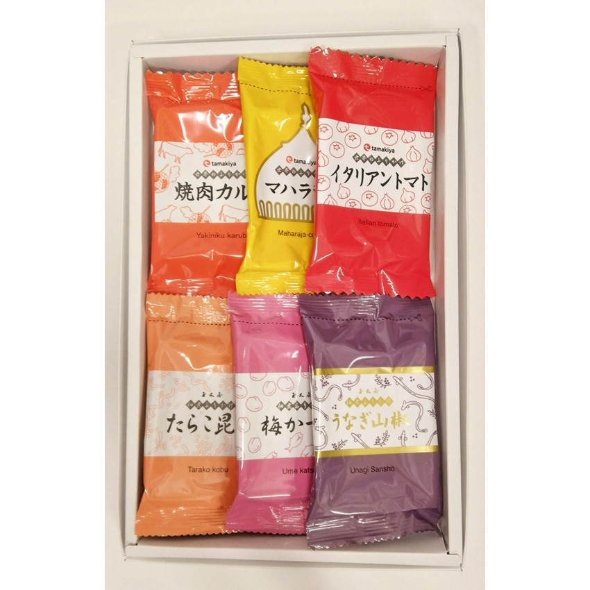 (うなぎ山椒・たらこ昆布・梅かつお・イタリアントマト・焼肉カルビ・マハラジャカレー 各1パック)
