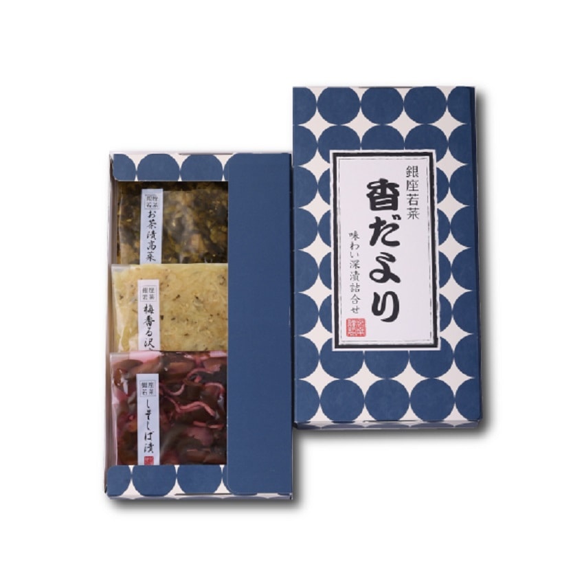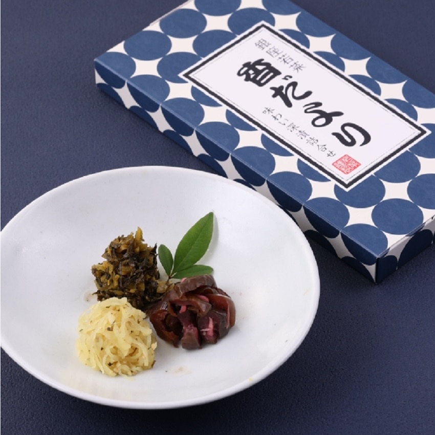 しそしば漬、お茶漬高菜、梅香るたくあんの3種を詰合せました。
