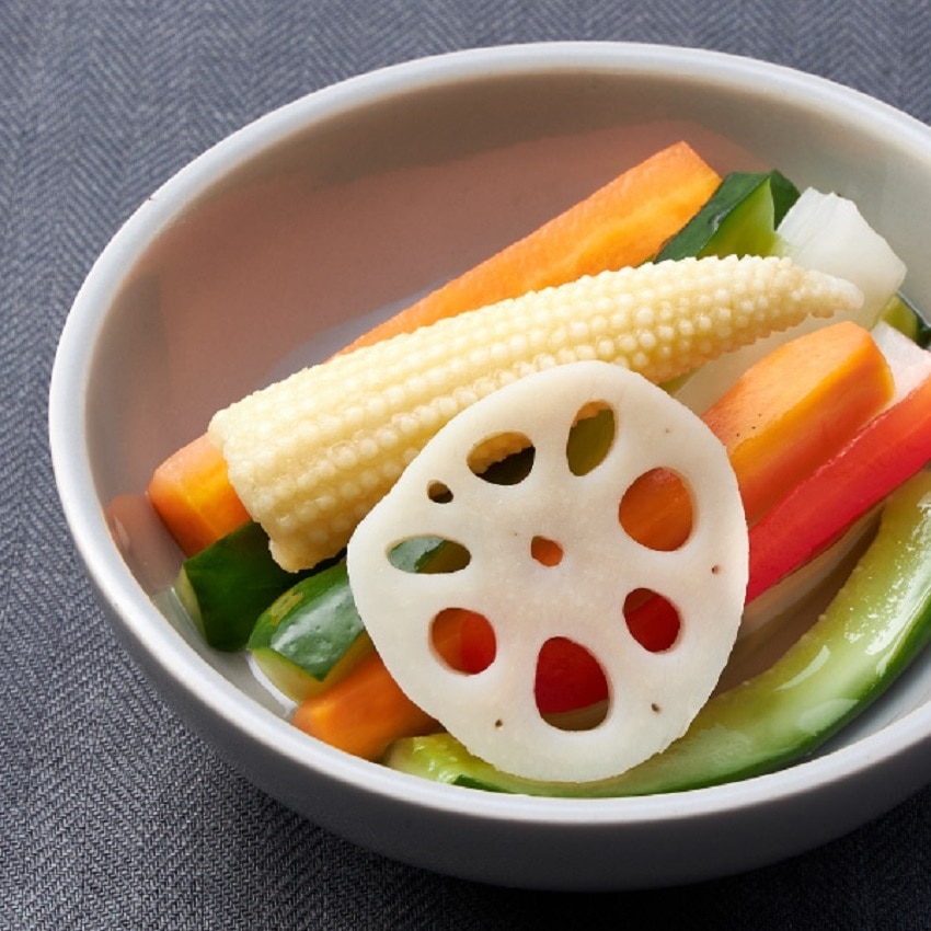 りんご酢とワインビネガーで、まろやかな酸味に仕上げた銀座ピクルスは酸っぱすぎず食べやすいと人気です!