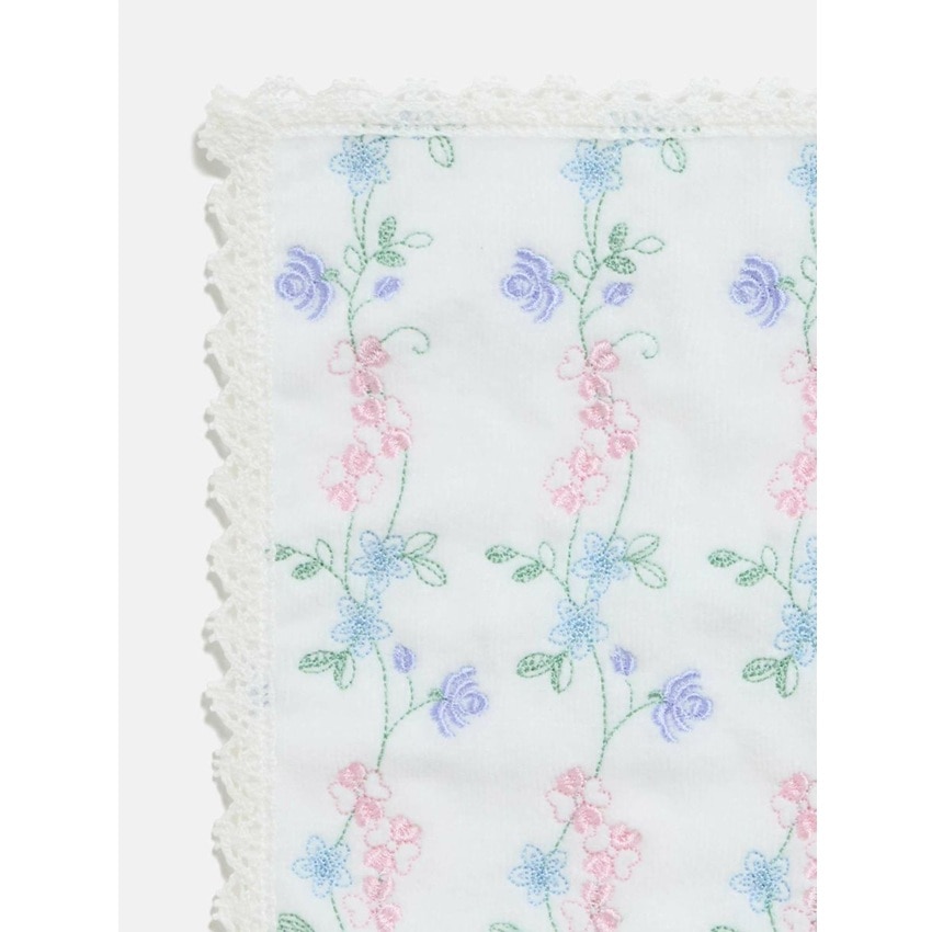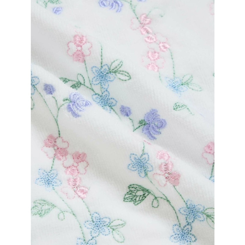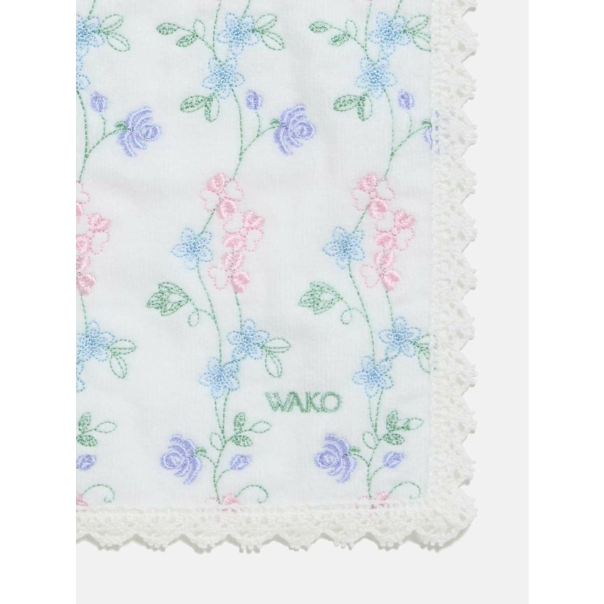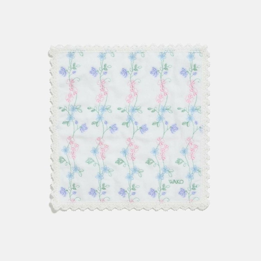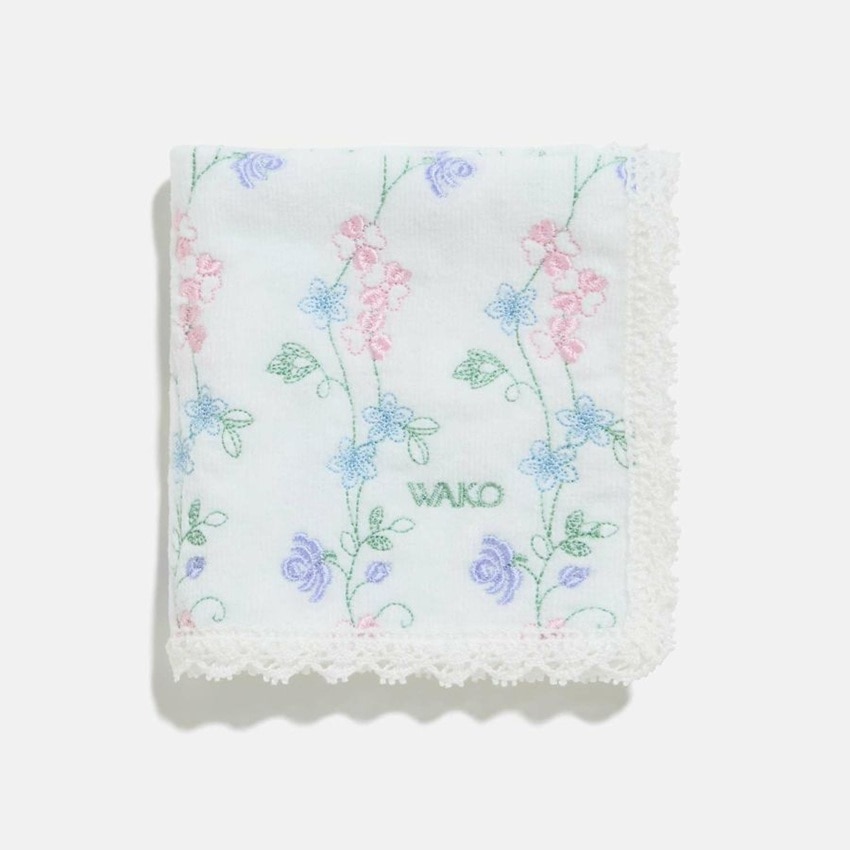 手に取るたびに心を和ませてくれる、水色のベースカラーに咲き誇る花々の刺繍が美しい一枚。