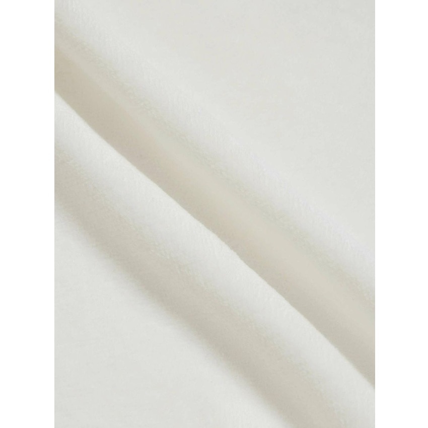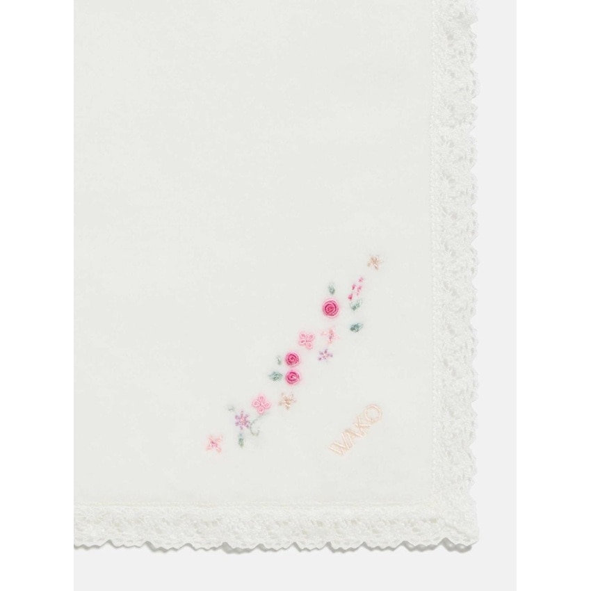 清潔感のある真っ白な生地に、ピンクやラベンダーの刺繍がさりげなく彩りを添え、エレガントな印象を与えます。
