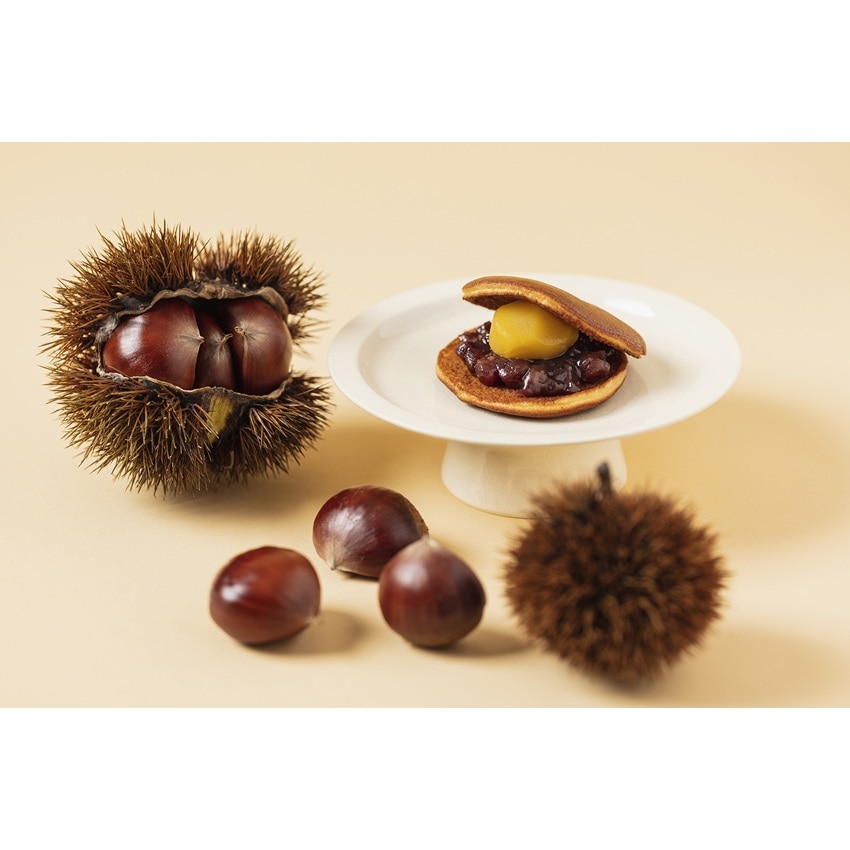 国産の和栗を丸ごと1個と北海道大納言小豆を煮立てた自家製どら餡を1枚1枚手焼きの薄カワで包み込みました。