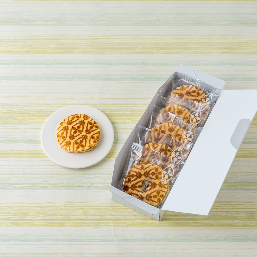粒あんと求肥を包んだ薄皮に四弁花文の焼印を押したどらやき