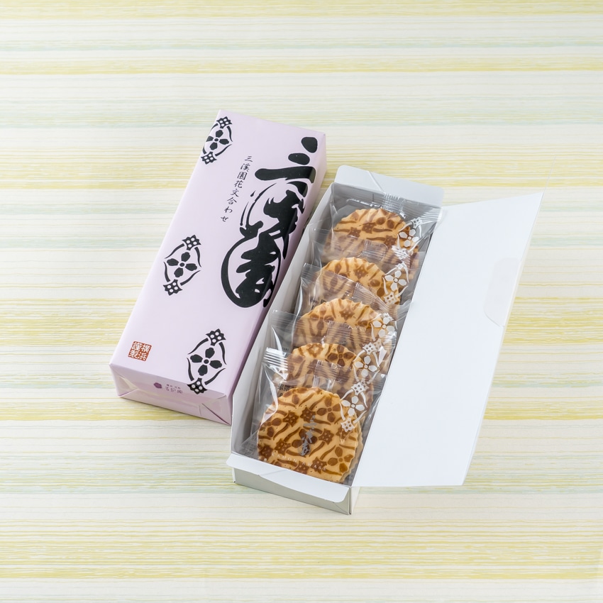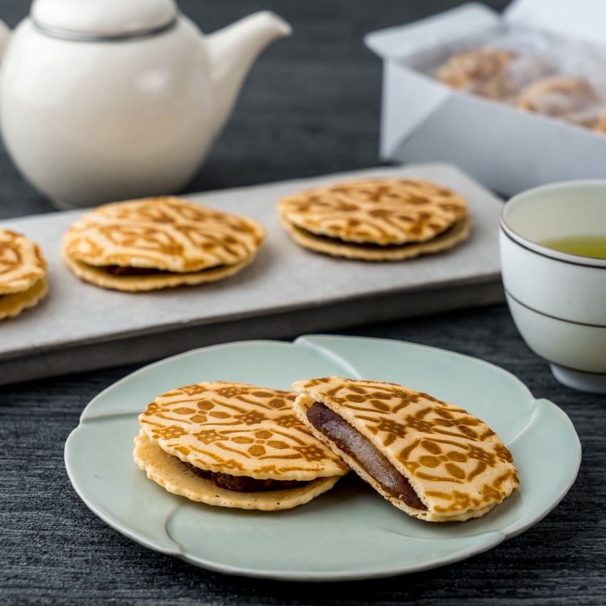 粒あんと求肥を包んだ薄皮に四弁花文の焼印を押したどらやき