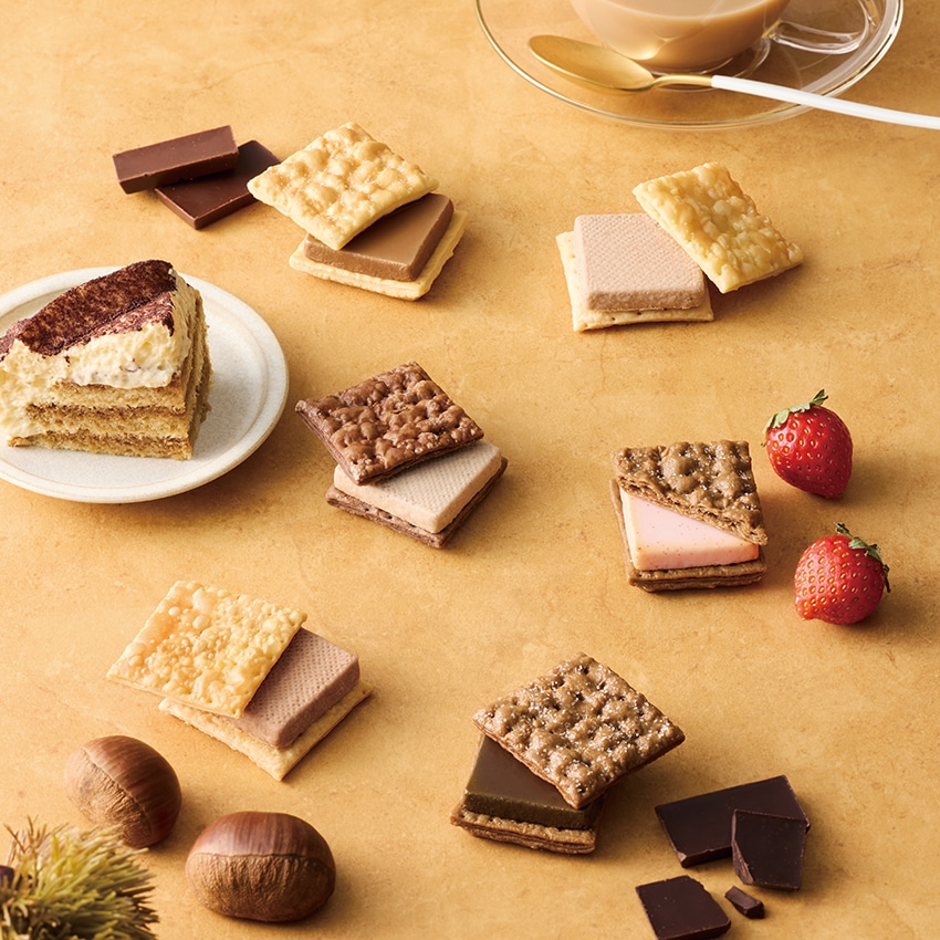 定番の「ビター・ミルク・ストロベリー」に加え、「マロン・ティラミス・ロイヤルミルクティー」の季節限定フレーバーを詰め合わせました。
