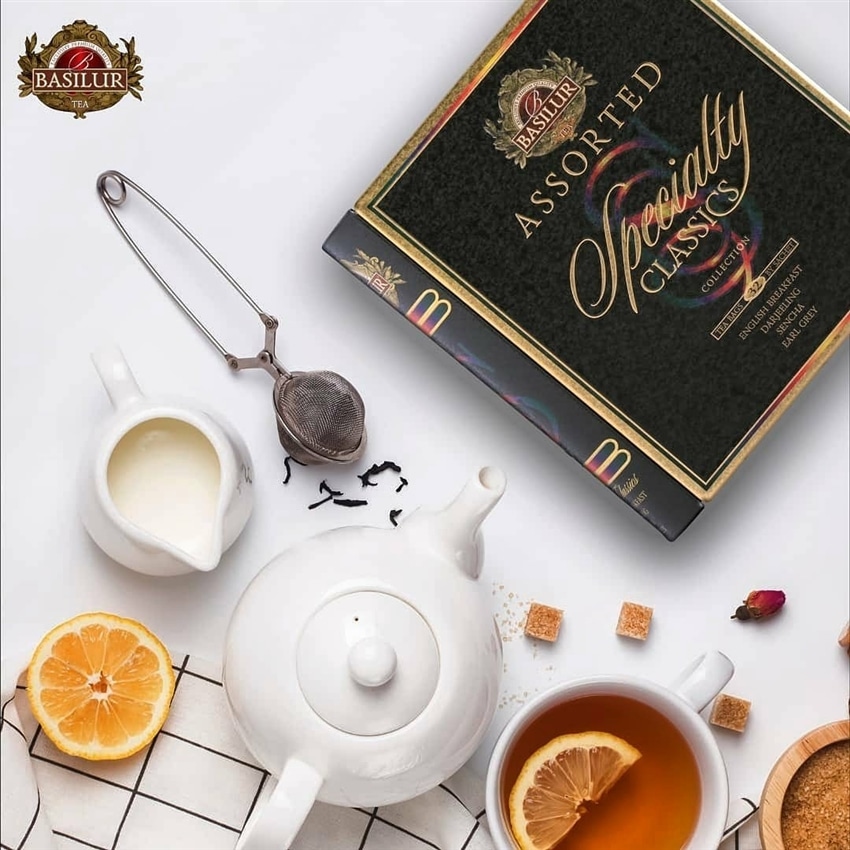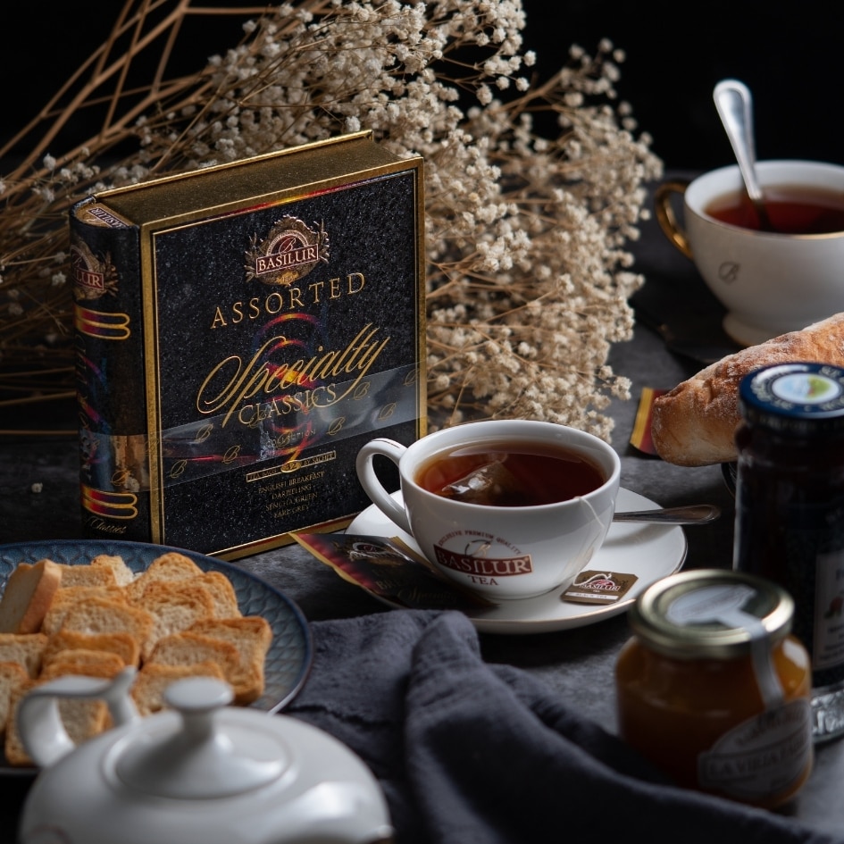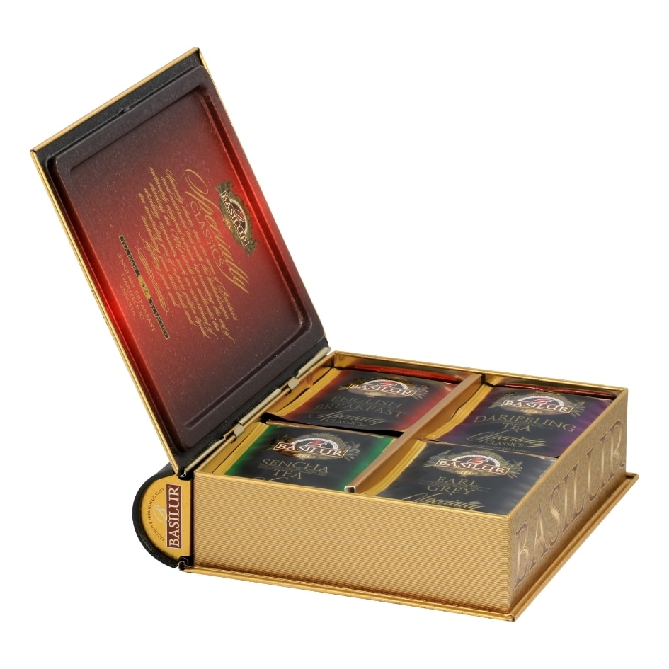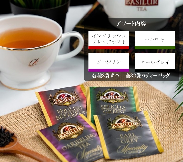 アソート内容は、イングリッシュブレックファースト、ダージリン、アールグレイ、グリーンティーです。4種類×各8袋入り。