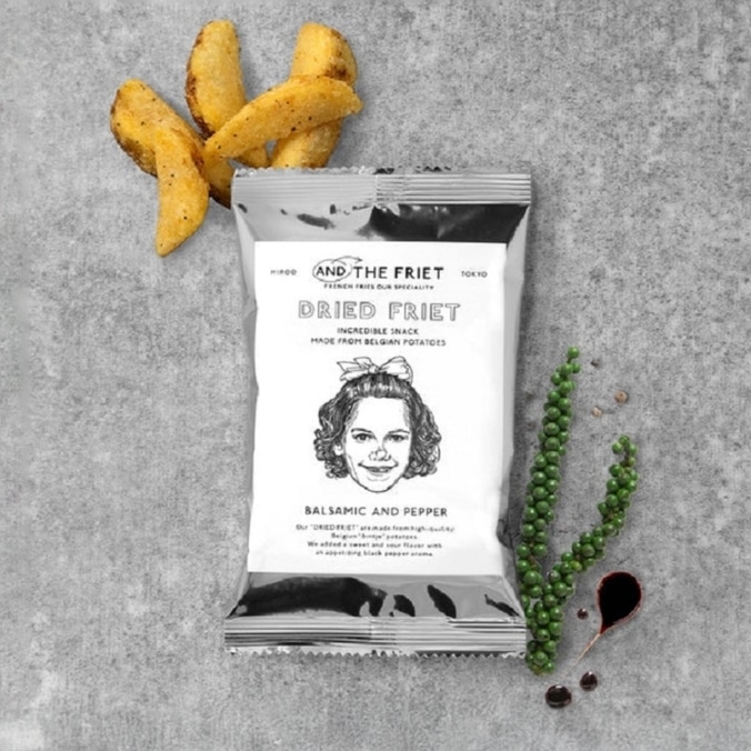 バルサミコ アンド ペッパーDRIED FRIET - BALSAMIC AND PEPPER世界各国から取り寄せた上質なジャガイモで作られたドライフリットに、フルーティな酸味が特徴のバルサミコのシーズニングを加えました。