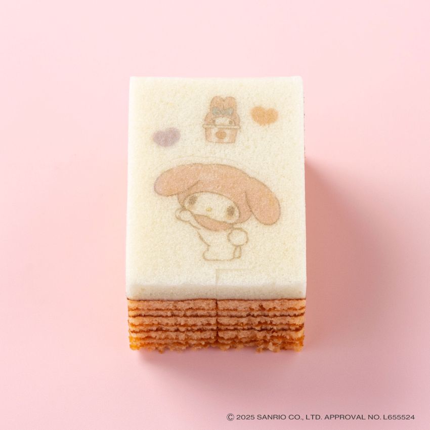 一枚ごとに、じっくり丁寧に焼き上げたいちご味の平焼きバウムを、マイメロディのかたちにカット。