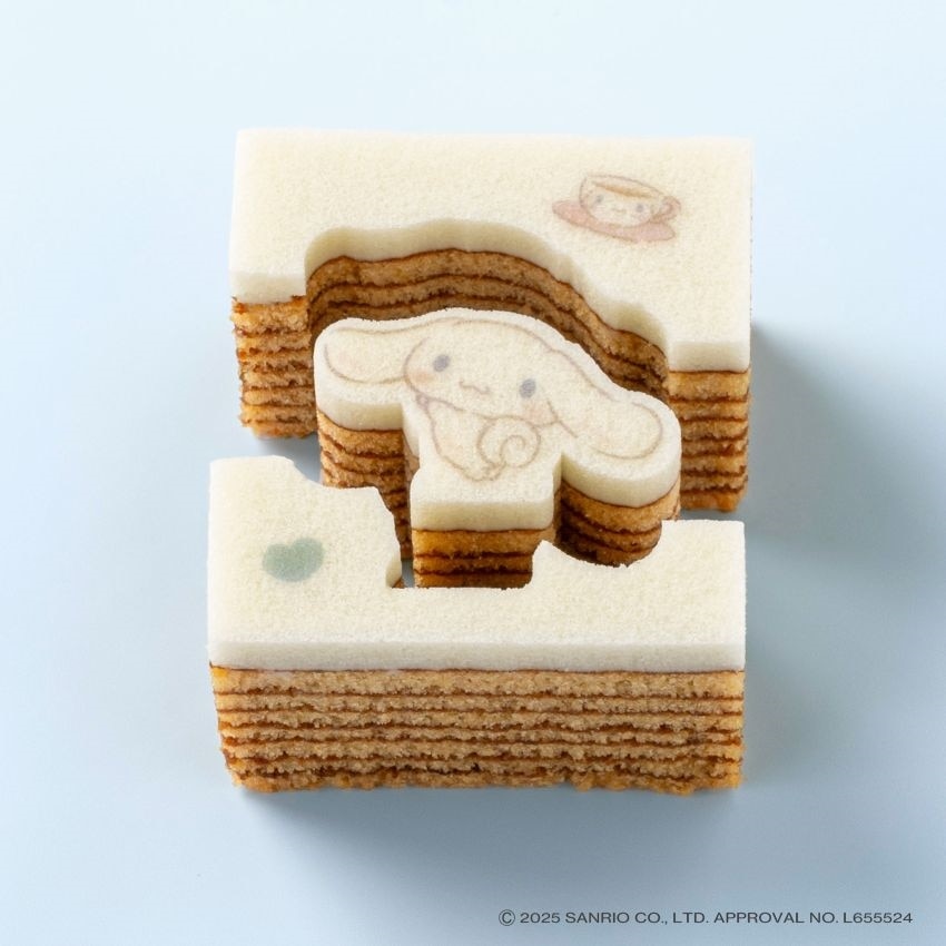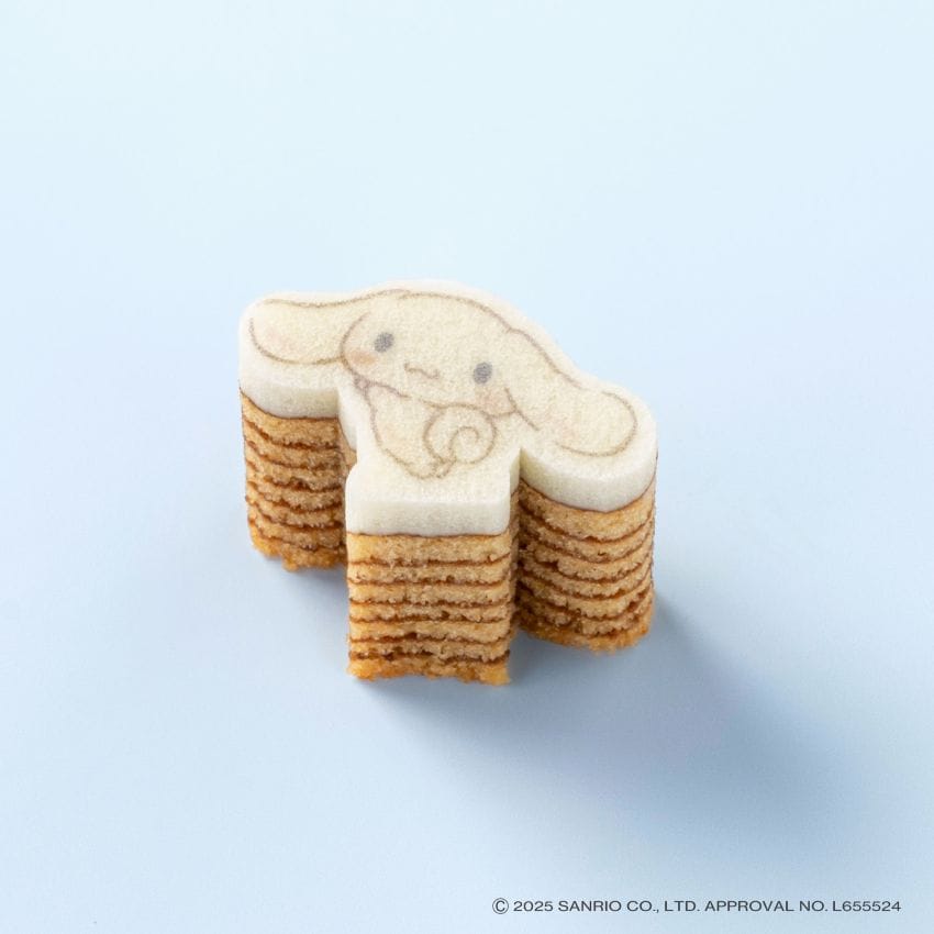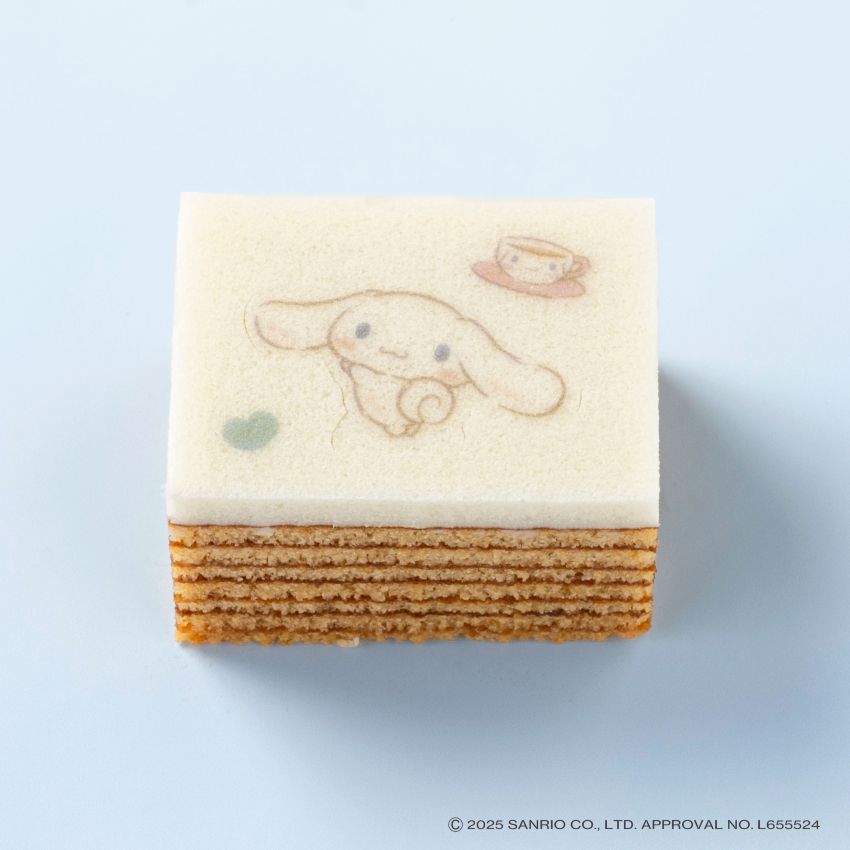 一枚ごとに、じっくり丁寧に焼き上げたメープル味の平焼きバウムを、シナモロールのかたちにカット。