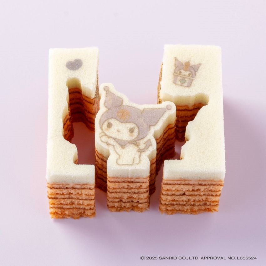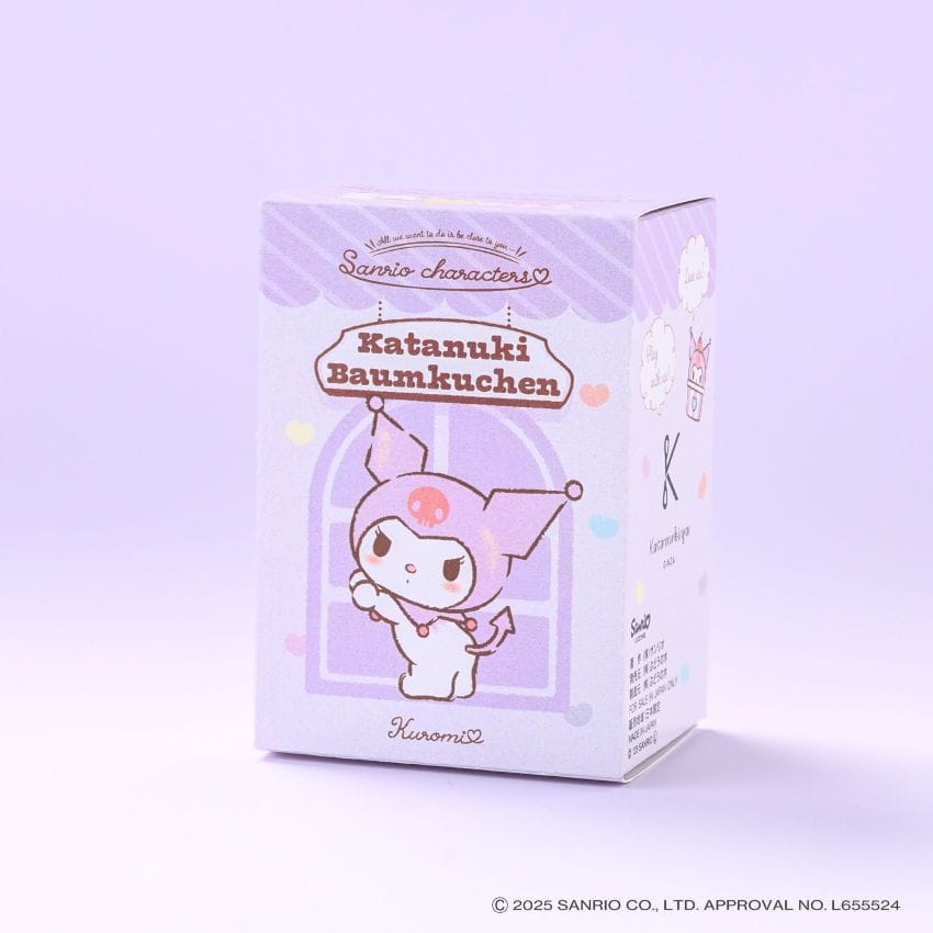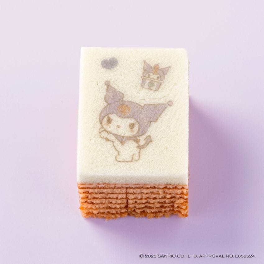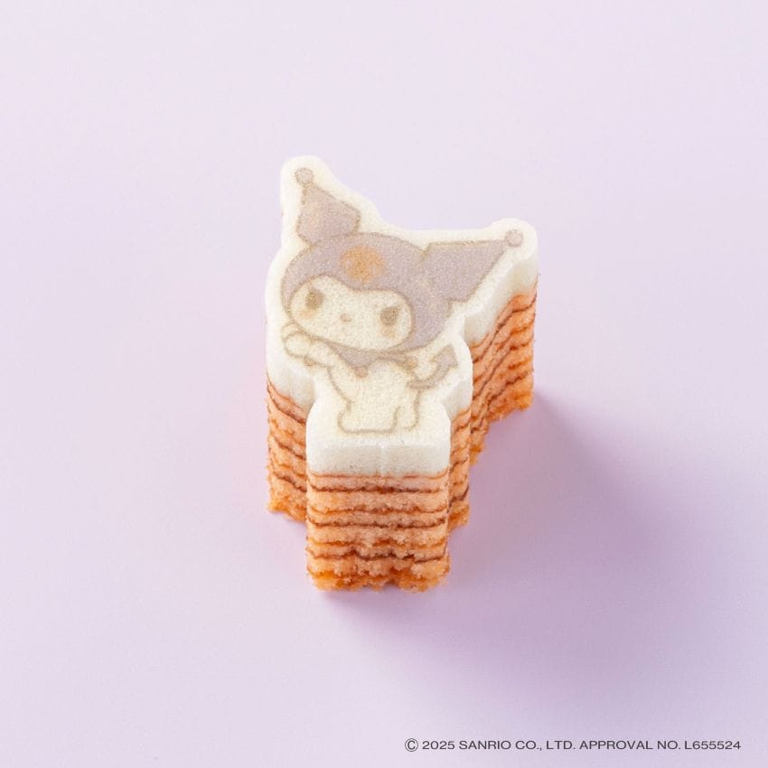 一枚ごとに、じっくり丁寧に焼き上げたいちご味の平焼きバウムを、クロミのかたちにカット。