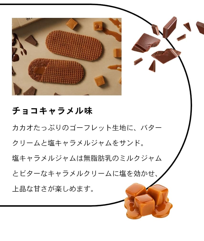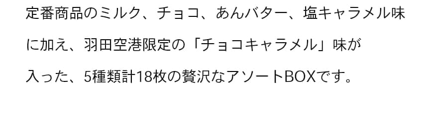 1箱18枚入 (チョコキャラメル×3枚 あんバター×3枚 塩キャラメル×3枚 チョコ×3枚 ミルク×6枚)