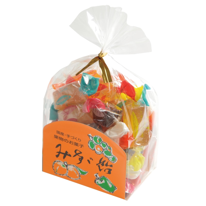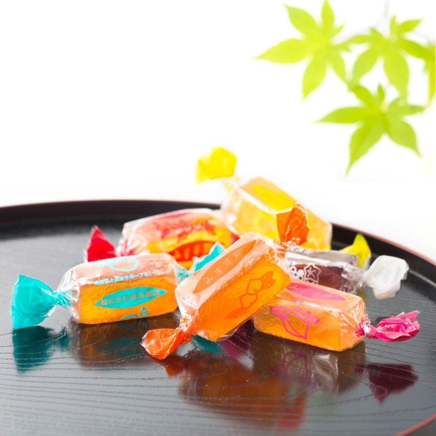 「あんず」「梅」「三宝柑」「ぶどう」「もも」「りんご」のセロファン包装型みすゞ飴を詰め合わせしました。