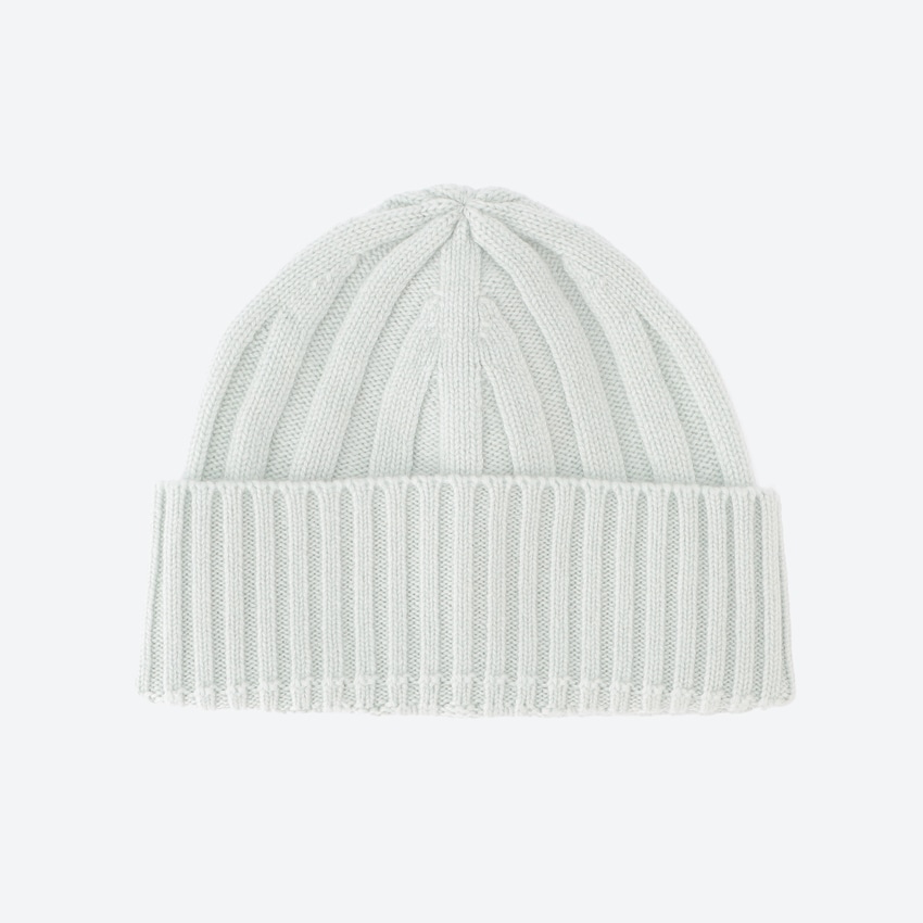 こちらは、縦のラインが美しいリブ編みをベースに、折り返しデザインを施したカシミヤニット帽です。