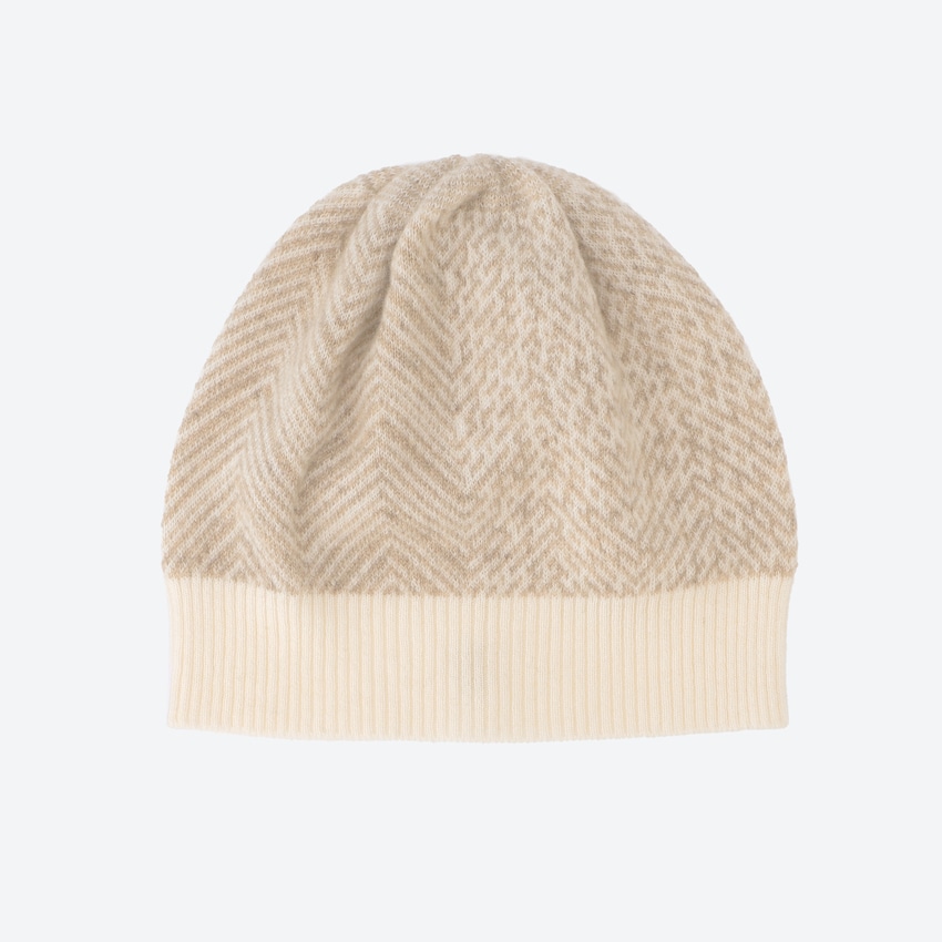 こちらは、クラシカルなヘリンボーン柄を全面に編み立てたデザインが特徴のカシミヤニット帽です。