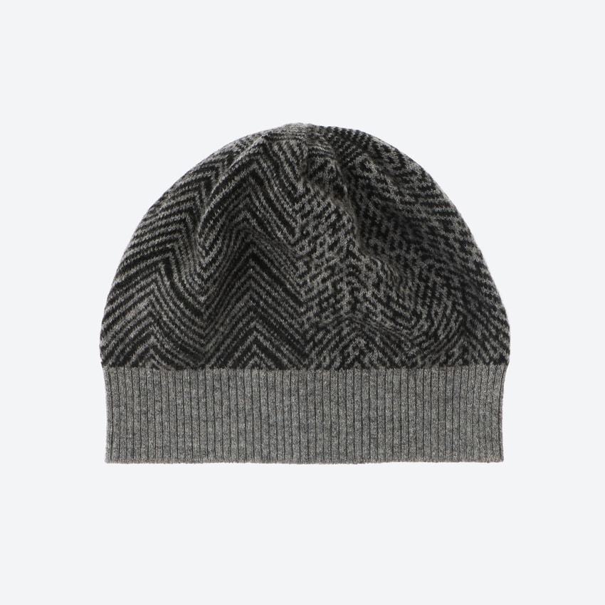 こちらは、クラシカルなヘリンボーン柄を全面に編み立てたデザインが特徴のカシミヤニット帽です。