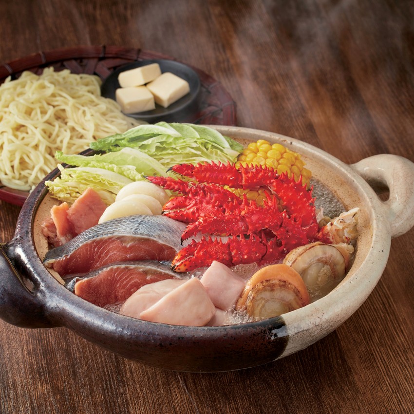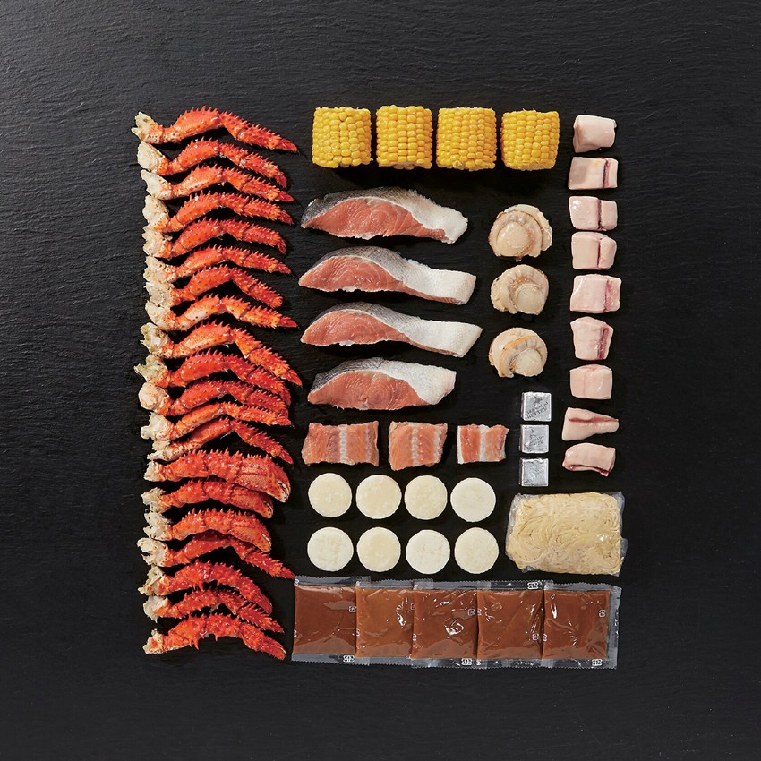 ■ 内容量:ゆで花咲がに脚500g、秋鮭切身4切(250g)、ゆで帆立・秋鮭白子各100g、秋鮭アラ50g、バター8g×3、カットコーン×4、いももち×8、ラーメン180g、鍋用味噌30g×5