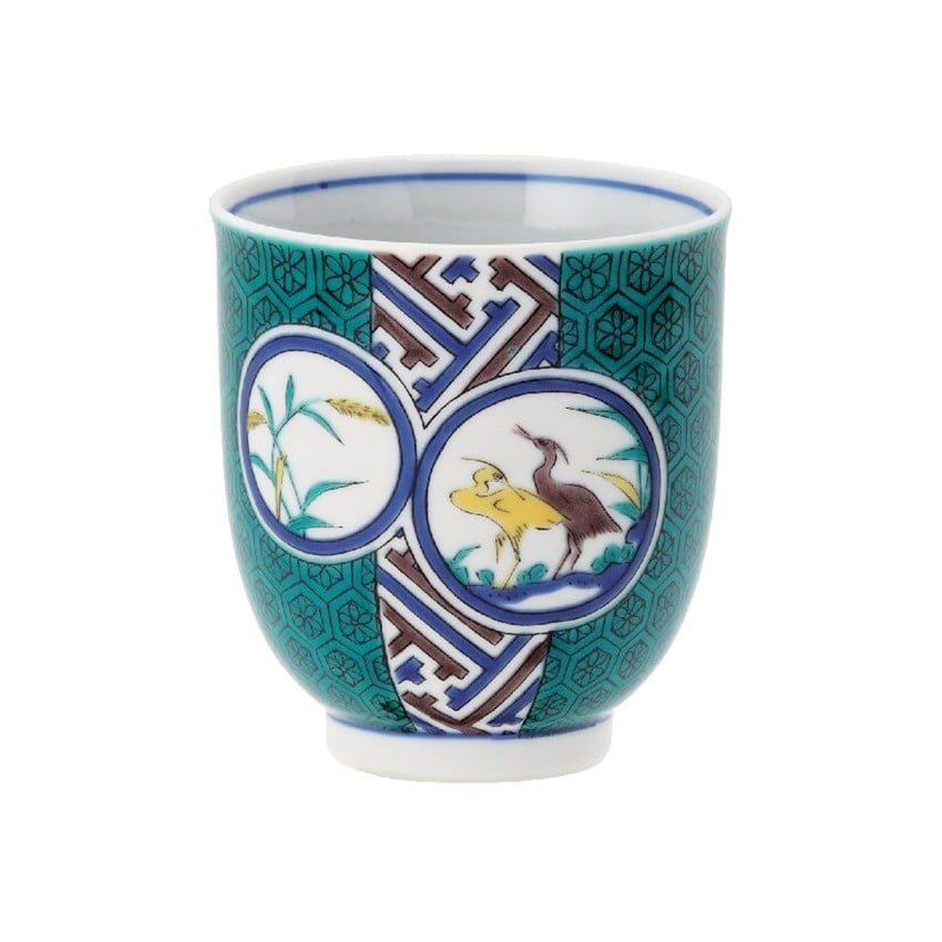 【商品説明文】九谷焼は明暦元年頃(1655年頃)石川県山中町九谷の地で良質の陶土が発見されたのを機に、藩主前田利治侯が、家臣後藤才次郎に命じてここに窯を築いたのが最初とされています。伝統柄である亀甲文を割取し、様々な小紋柄と夫婦鷺を絵付けした湯呑です。