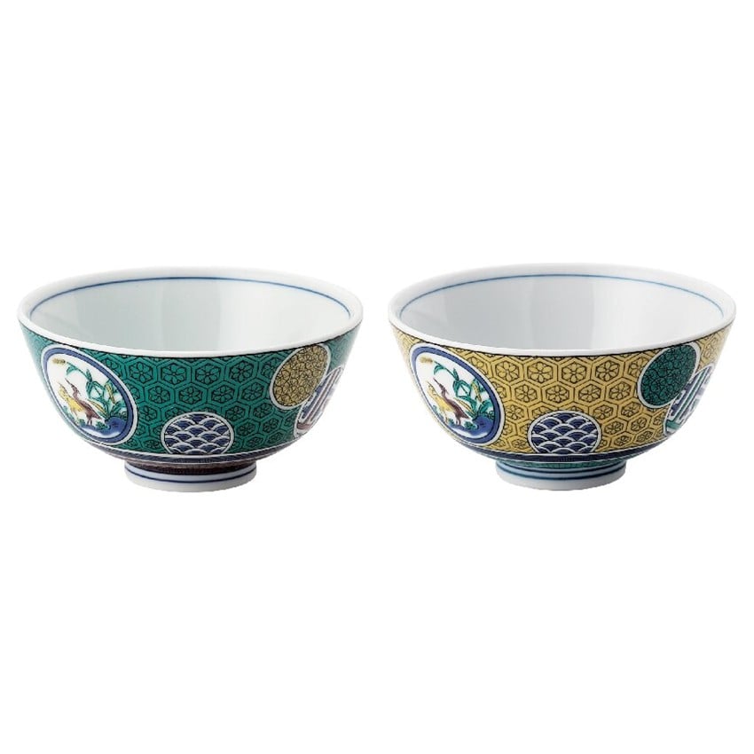 【商品説明】伝統柄である亀甲文を呉須描きし、その上から様々な小紋柄と夫婦鷺を絵付けした組飯碗です。