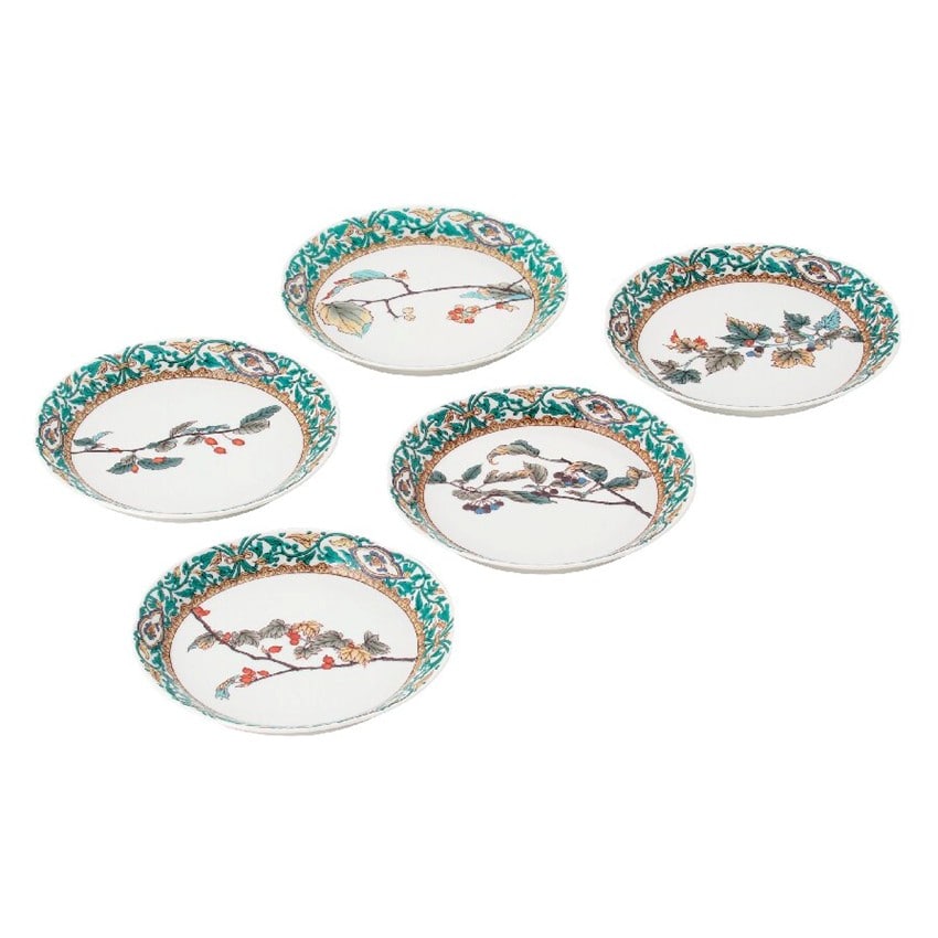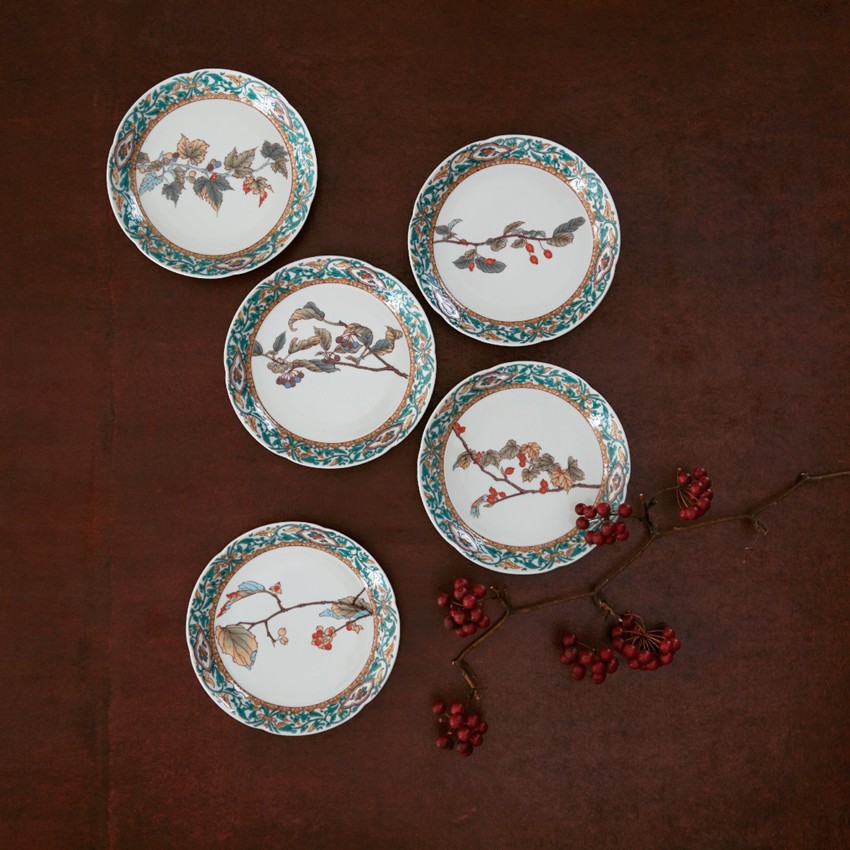 【商品説明】縁に鮮やかな唐草をあしらい、中央には野山に自生する木の実などの果実がシックな色味で絵付けされています。
