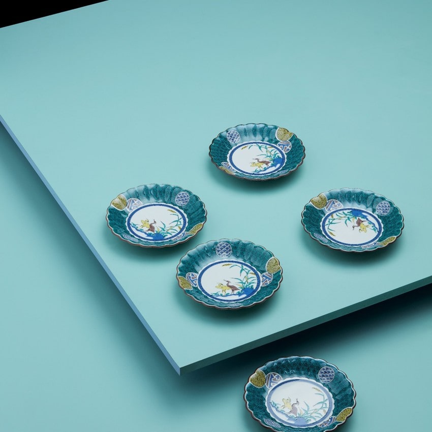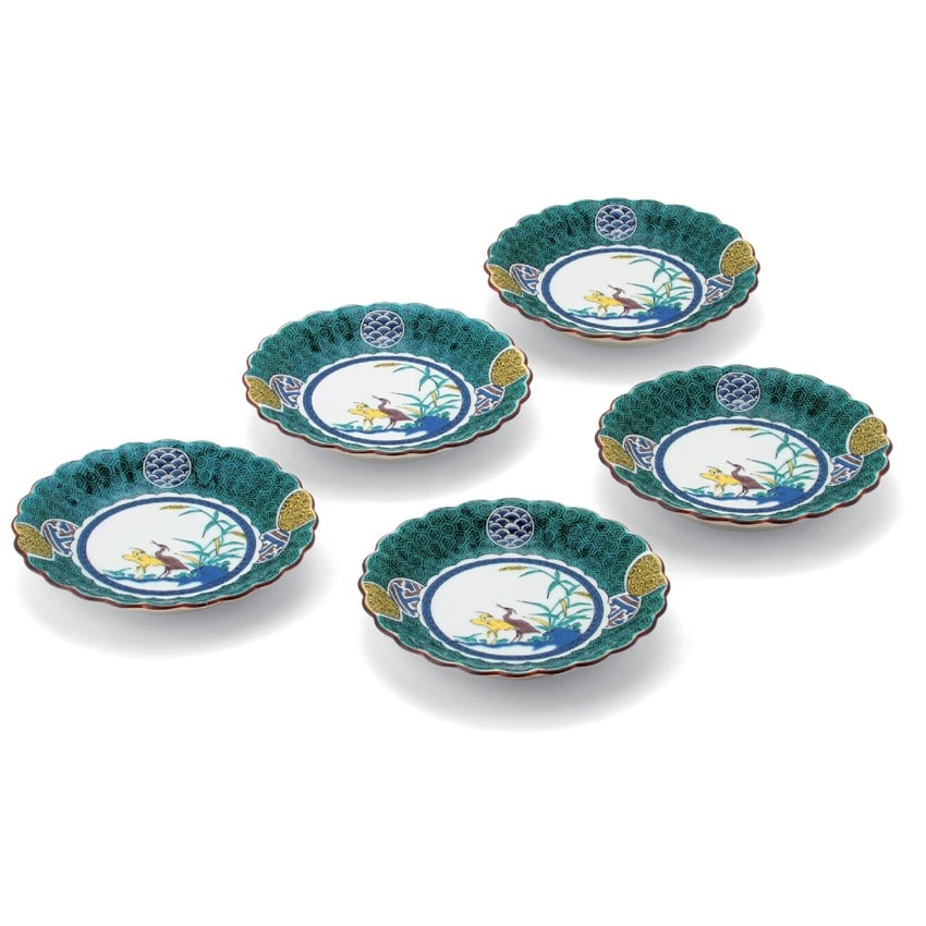 【商品説明文】九谷焼創始期の古九谷に見られるような重厚感の感じられる皿を5枚セットにしました。絵付けの重厚感もさることながら、食材を美しく見せる菊型の形状にもこだわるなど、和食器の奥深さを感じていただける器です。