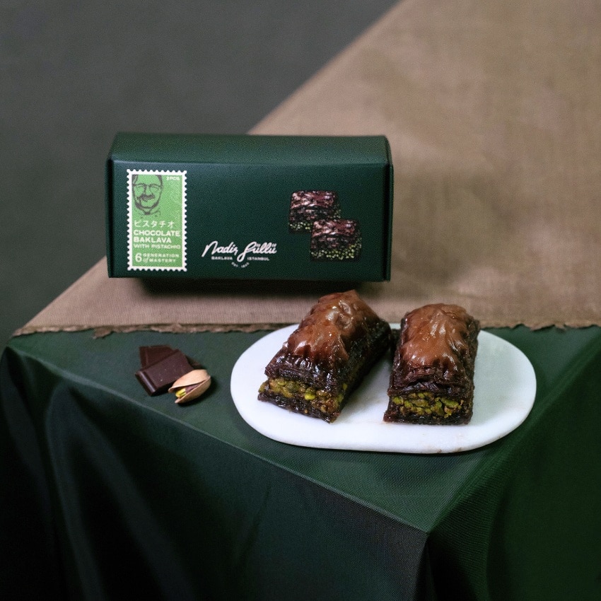 チョコレートピスタチオバクラヴァ:薄いパイ生地が40層にも重なった、定番のピスタチオバクラヴァの生地にチョコレートを練り込んだバクラヴァ。