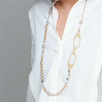 ルーペを外して、パールのロングネックレスとして、お手持ちのジュエリーとコーディネートをお楽しみ頂けます。1連でシンプルに、2重で華やかに首元を彩ります。