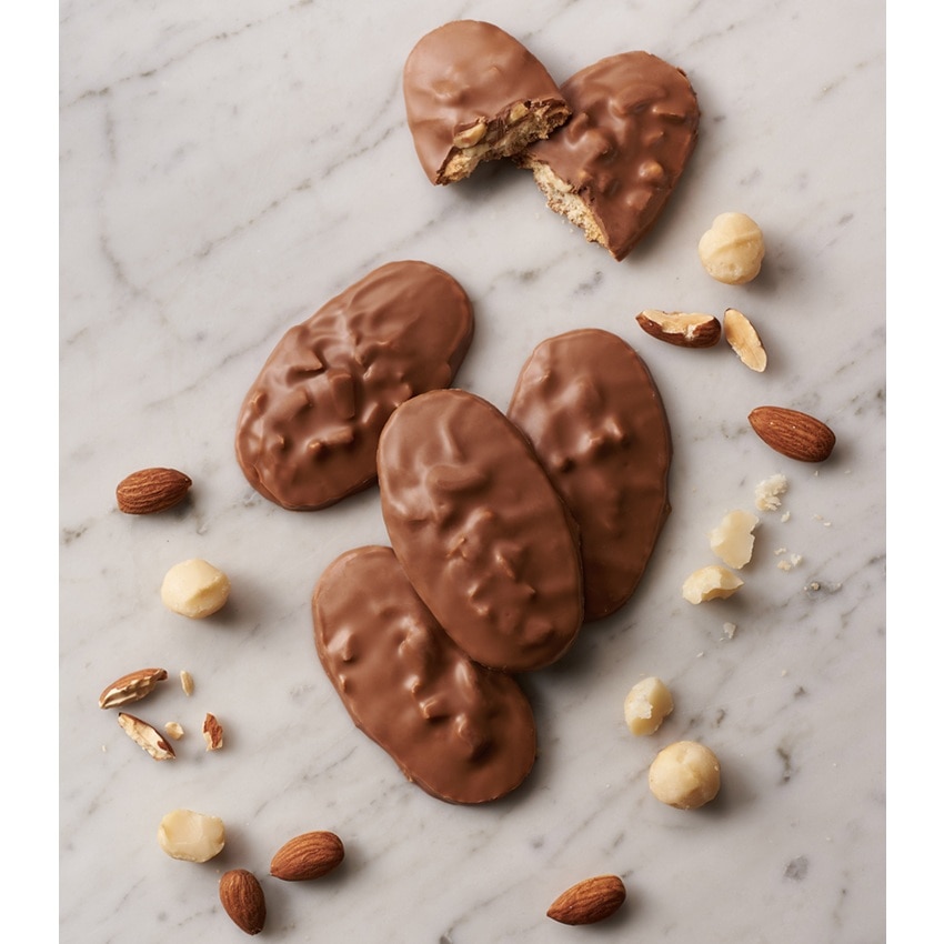 サクサクの食感に焼き上げたサブレに、マカダミアナッツ、アーモンドをのせ、クーベルチュールのミルクチョコレートでコーティングしました。