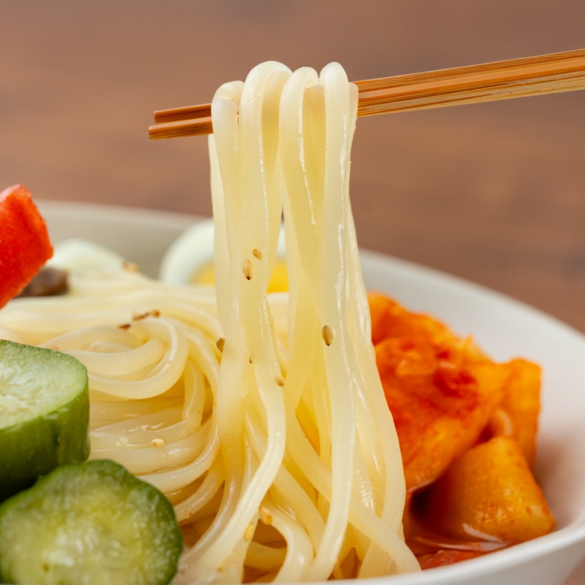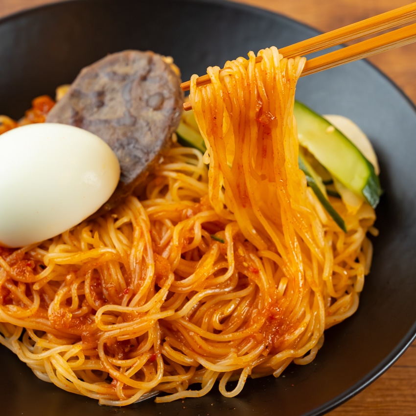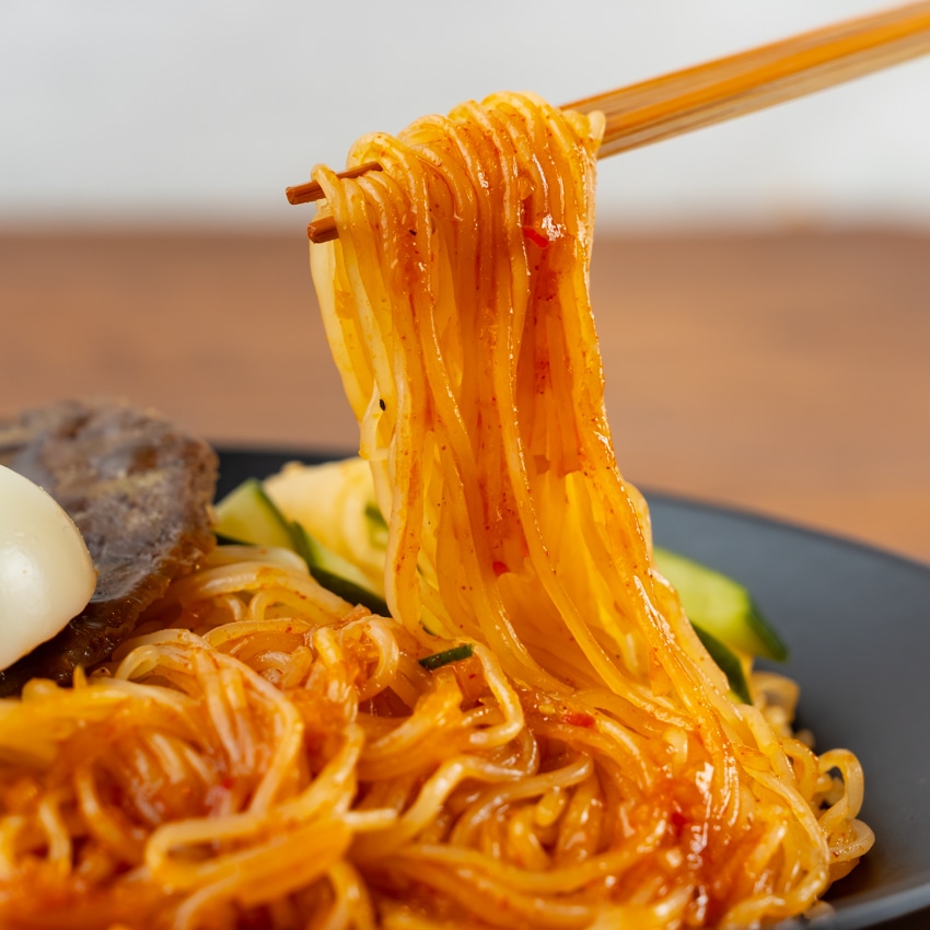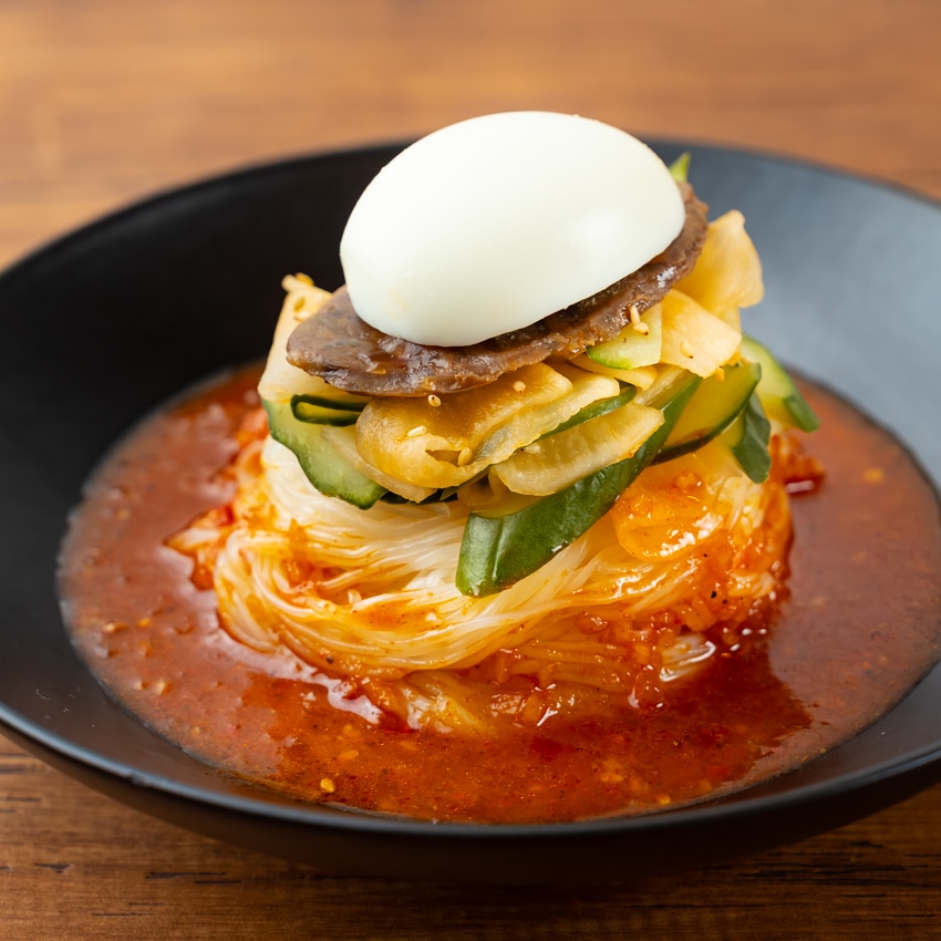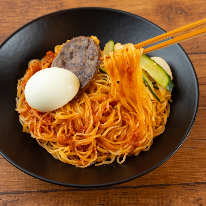 熟成発酵し続ける甘辛べジソースが、つるりとした食感の極細麺に良く絡むピビン冷麺。