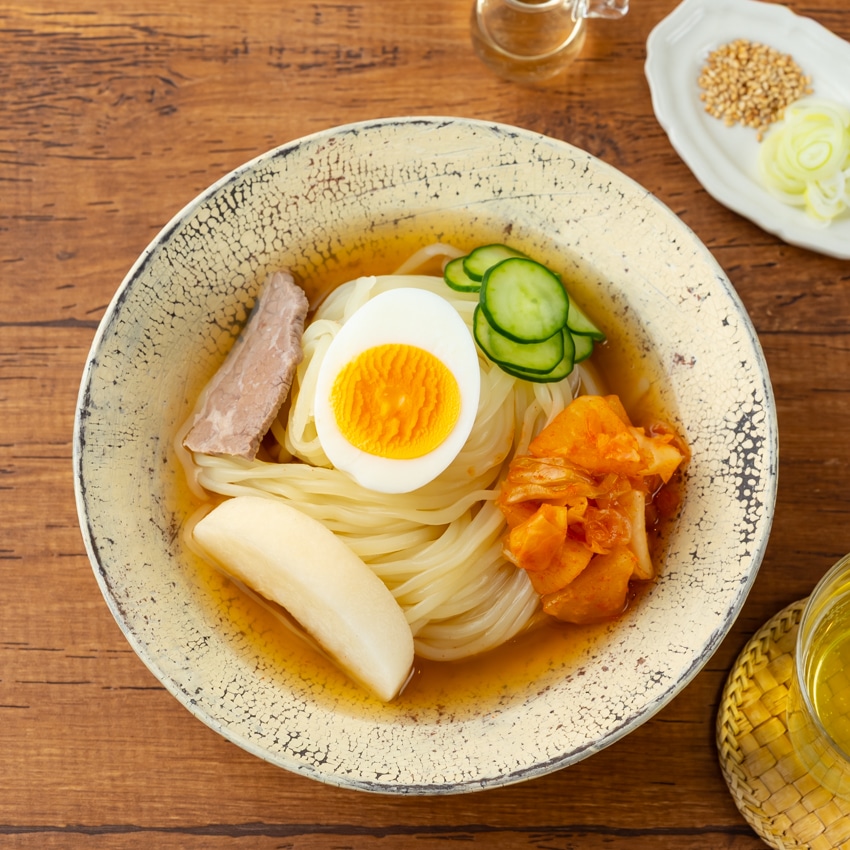 もちもちとした弾力とつるりとした食感の本格生麺に、牛骨ベースのコク深いストレートスープと、爽やかな酸味の冷麺専用キムチの相性が抜群。麺とスープとキムチが奏でる三味一体の調和が絶妙です。