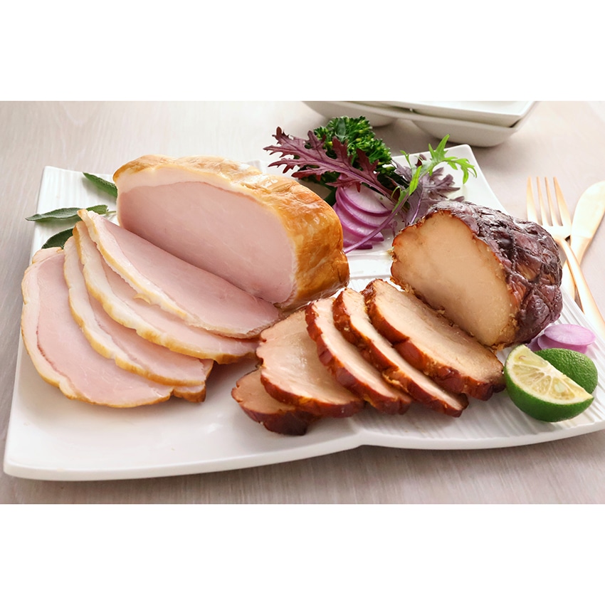 じっくり伝統の調味液に漬け込んだ熟成製法のロースハムと豚もも肉を醤油ベースの和風たれにつけ、焼き上げた焼豚のセットです。