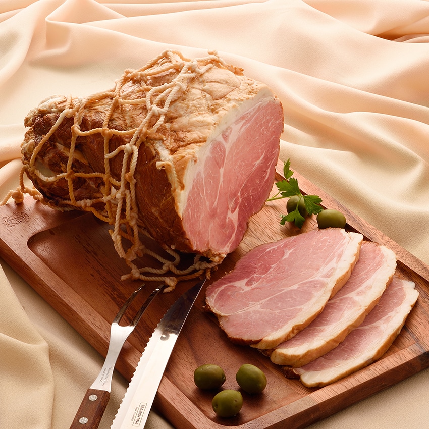 豚もも肉を骨付きのままハムに仕上げました。部位ごとに異なる味や食感をお楽しみいただけます。
