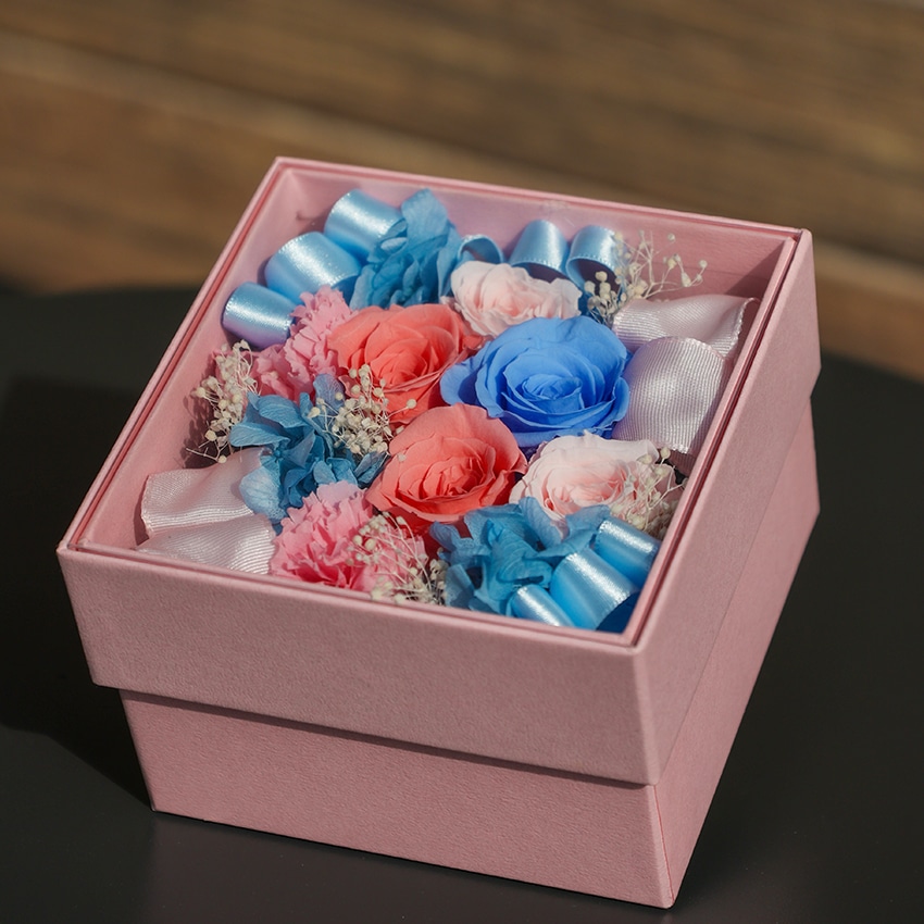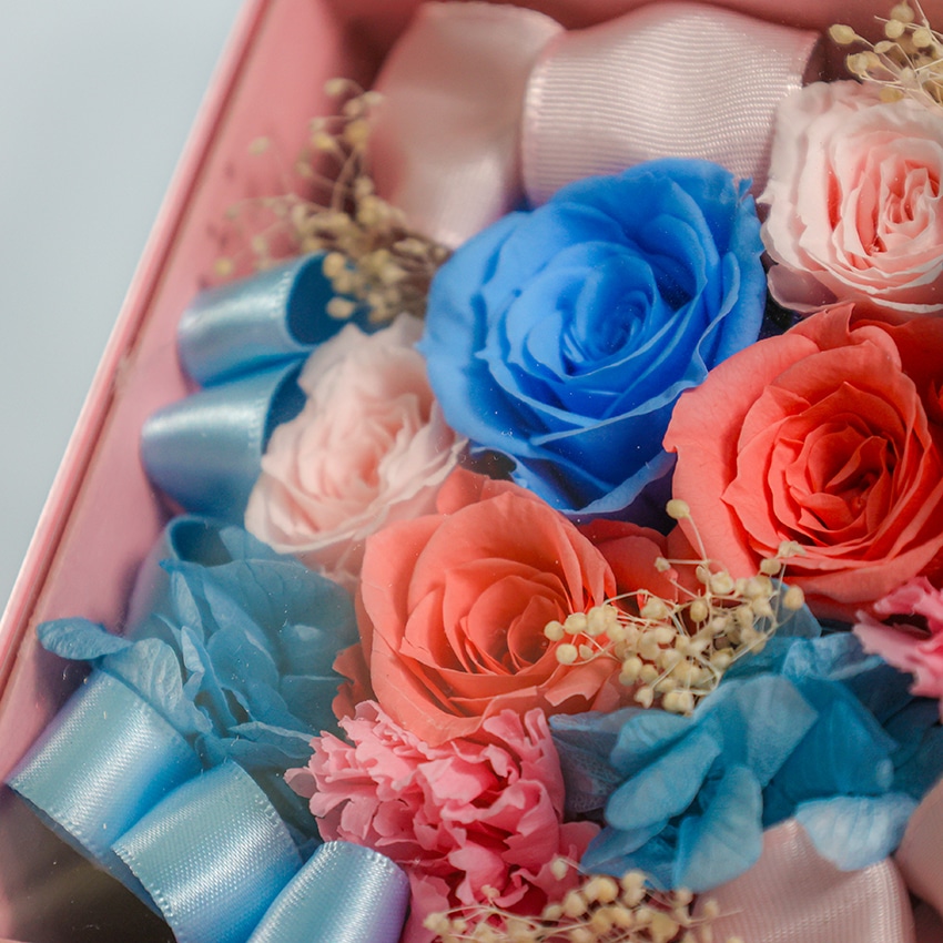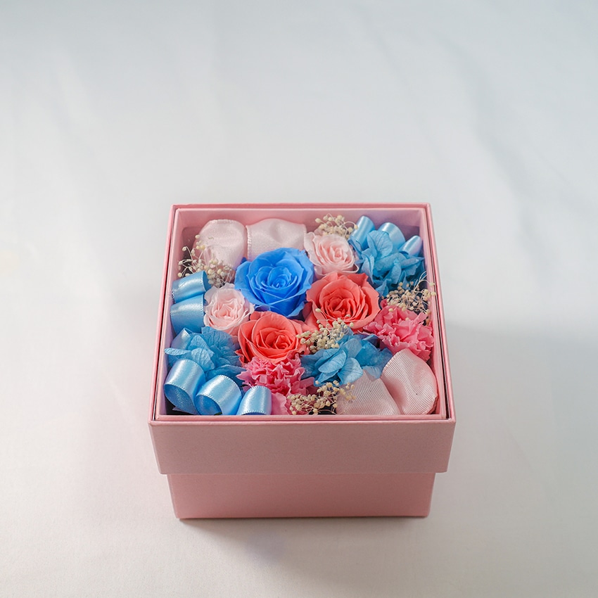 淡い「ピンク」と空をイメージした「水色」のプリザーブドフラワーを、上品なBOXにアレンジ。