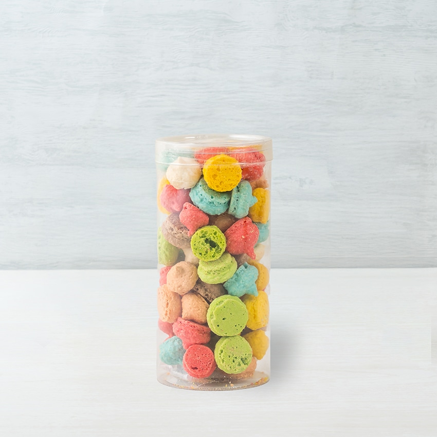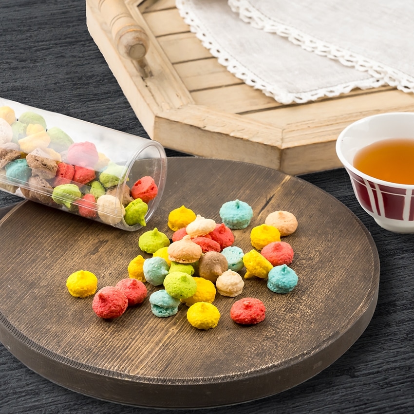 看板商品のマカロンの魅力をもっと手軽に味わってもらいたいという想いから創作したオリジナル商品が、マカロンボーロです。マカロン生地にショコラ・イチゴ・レモン・ピスタチオ・バニラ・カラメル・アーモンドの7種のフレーバーで味付けをし、ミニサイズに小さく絞り出しサクッと軽い食感に焼き上げたお菓子で、常温で日持ちのするマカロンなのでお土産にも最適です。
