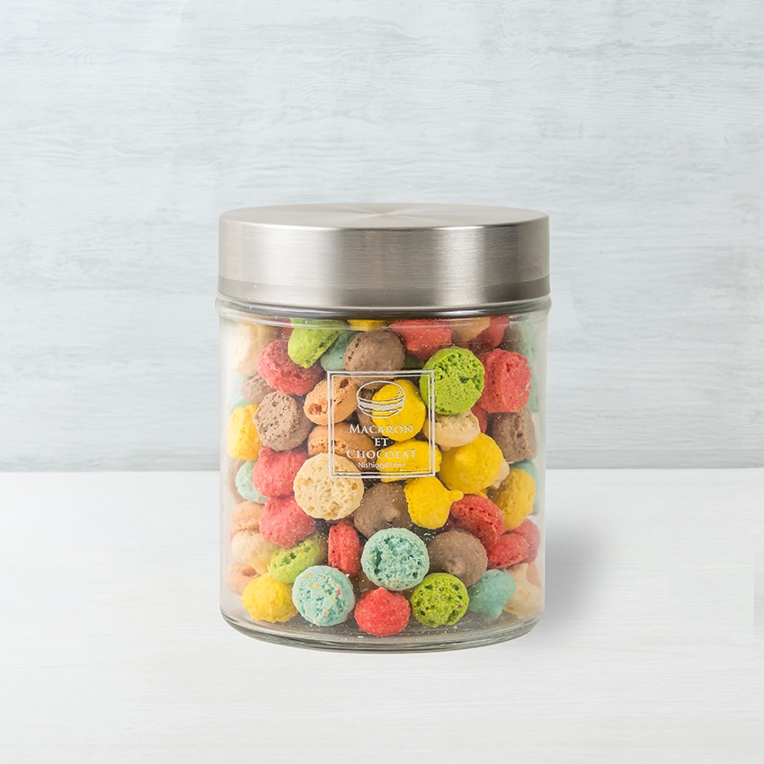 看板商品のマカロンの魅力をもっと手軽に味わってもらいたいという想いから創作したオリジナル商品が、マカロンボーロです。マカロン生地にショコラ・イチゴ・レモン・ピスタチオ・バニラ・カラメル・アーモンドの7種のフレーバーで味付けをし、ミニサイズに小さく絞り出しサクッと軽い食感に焼き上げたお菓子で、常温で日持ちのするマカロンなのでお土産にも最適です。