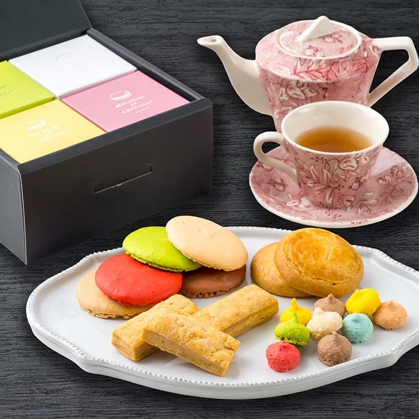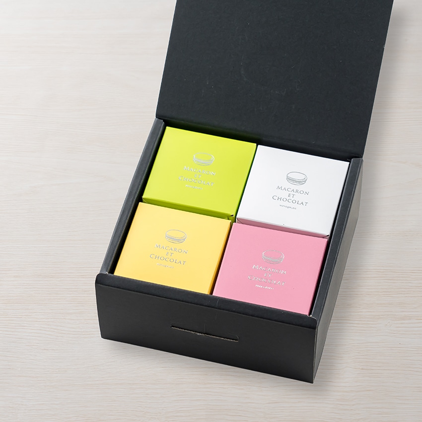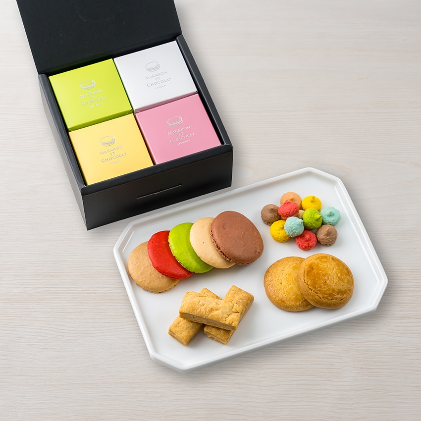 MACARON ET CHOCOLATで人気のオリジナルスイーツの中から4種類をチョイス。マカロン生地に色々なフレーバーで味付けをした「マカロンボーロ」、黒コショウのスパイスが効いたサクサクのパイ「エダムチーズ」、塩とバターの風味が特徴のバターサブレ「サブレ・ブルトン」、マカロン生地を2度焼きしザクザク食感に仕上げた「マカロンラスク」をそれぞれ小箱に入れてセットにしました。