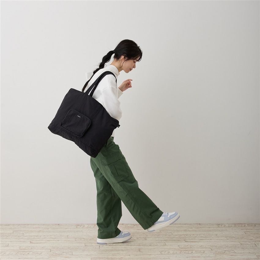 外ポケットにさっと折りたたむとトートバッグになる遊び心のあるデザイン。