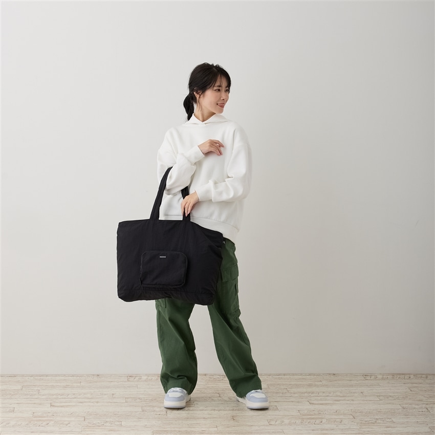 外ポケットにさっと折りたたむとトートバッグになる遊び心のあるデザイン。
