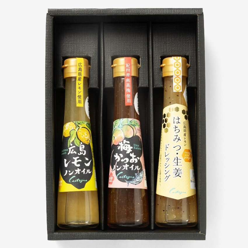 広島レモンノンオイルドレッシング、梅かつおノンオイルドレッシング、はちみつ生姜ドレッシングのセット。