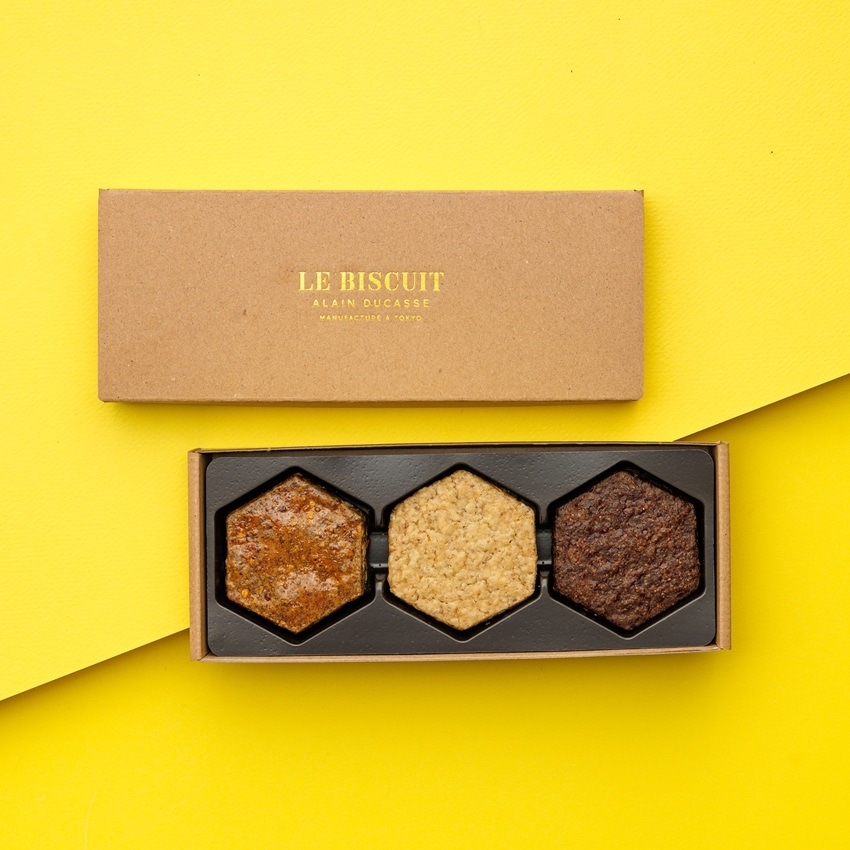 羽田空港限定で提案する、手土産や旅のおともに提案する3種(ビスキュイ・ヴァニーユ、ビスキュイ・サラザン、ビスキュイ・ポレンタ・ショコラ)のコンパクトな詰め合わせ。