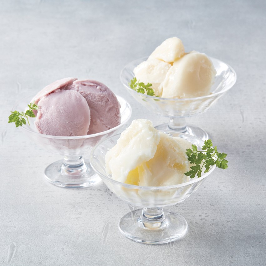 【商品説明文】十勝産の生乳と余市産のフルーツを使用した北海道の恵みが詰まったリッチな3種のシャーベットです。