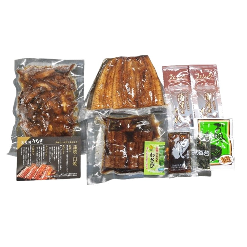 ■ 内容量:うなぎ蒲焼カット80g×1、刻みうなぎ(タレ込)60g×1、うなぎ肝の蒲焼100g×1、タレ・山椒×1、刻み海苔×1、わさび×1、出汁×1、吸物×1