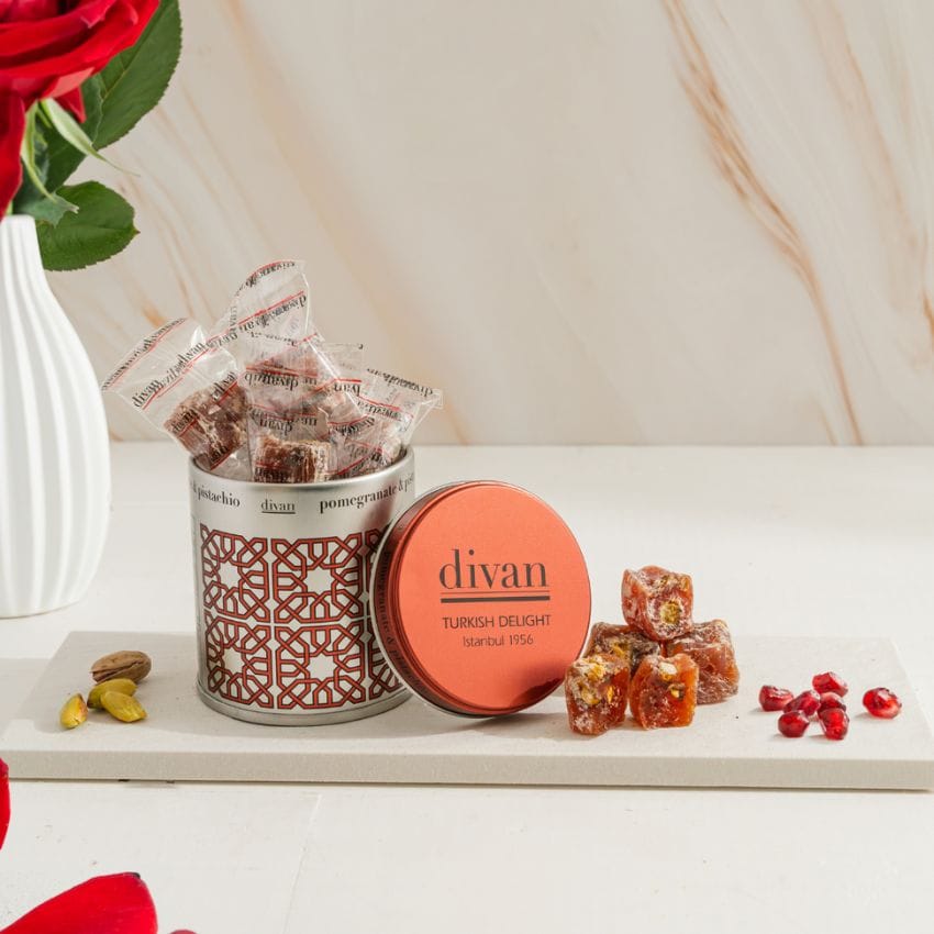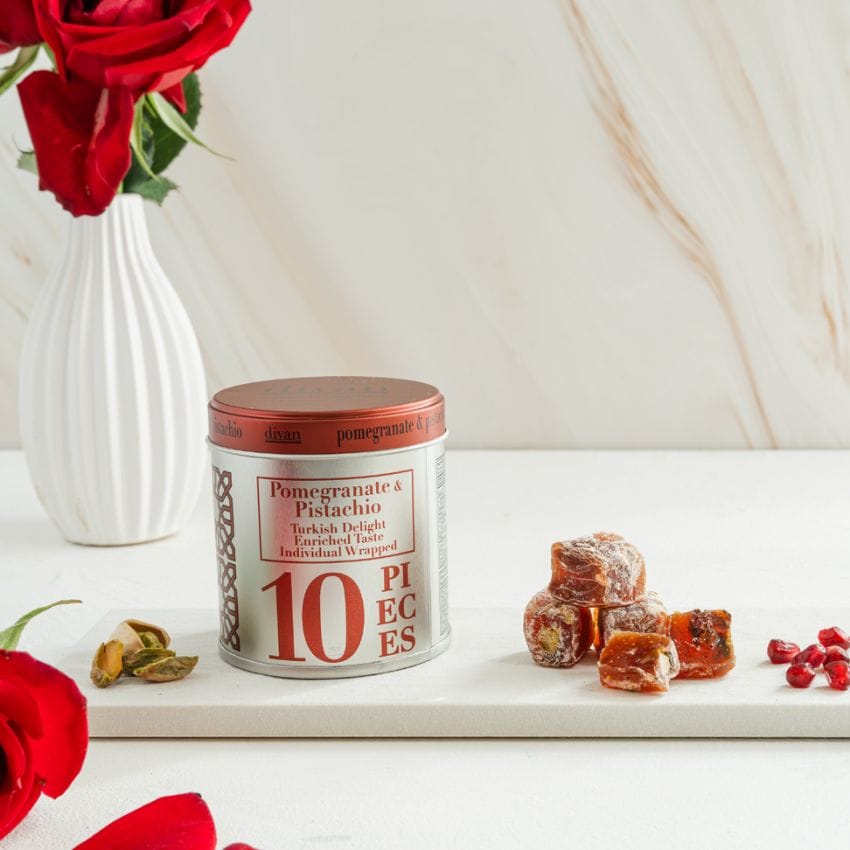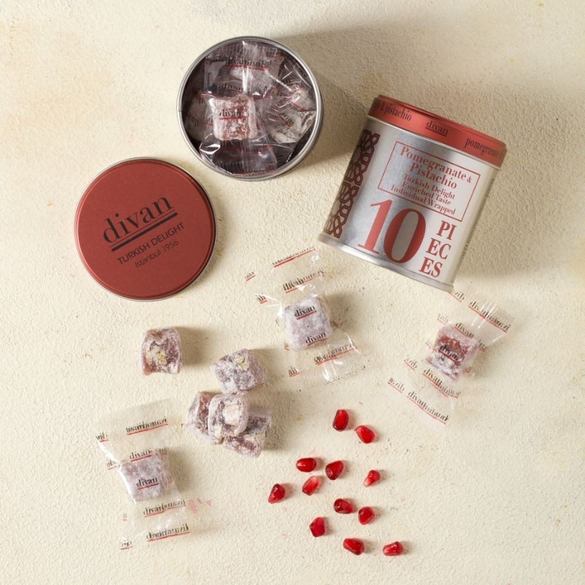 1950年代から愛されているディバンの定番商品「ピスタチオターキッシュディライト」に、トルコの名産品であるザクロのフレーバーがつけられた香り豊かなターキッシュディライトです。