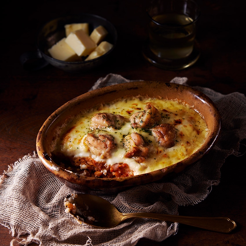 トマトの酸味と甘みがあるチキンライスと濃厚なジャージー牛乳を使用したベシャメルソース、ジューシーにグリルしたチキンが相性抜群です。