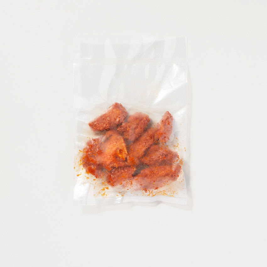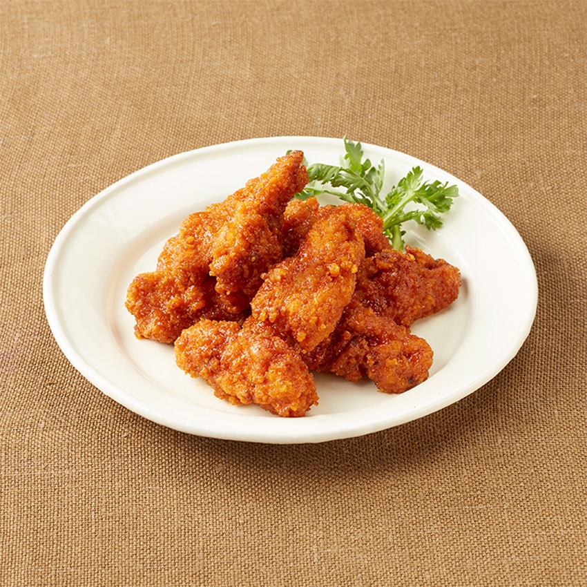 自社ブランド鶏「4Xチキン」のささみ肉に衣を付けて揚げた後にコチュジャンで辛味を付け、隠し味にピーナッツペーストを効かせてコクを出しています。