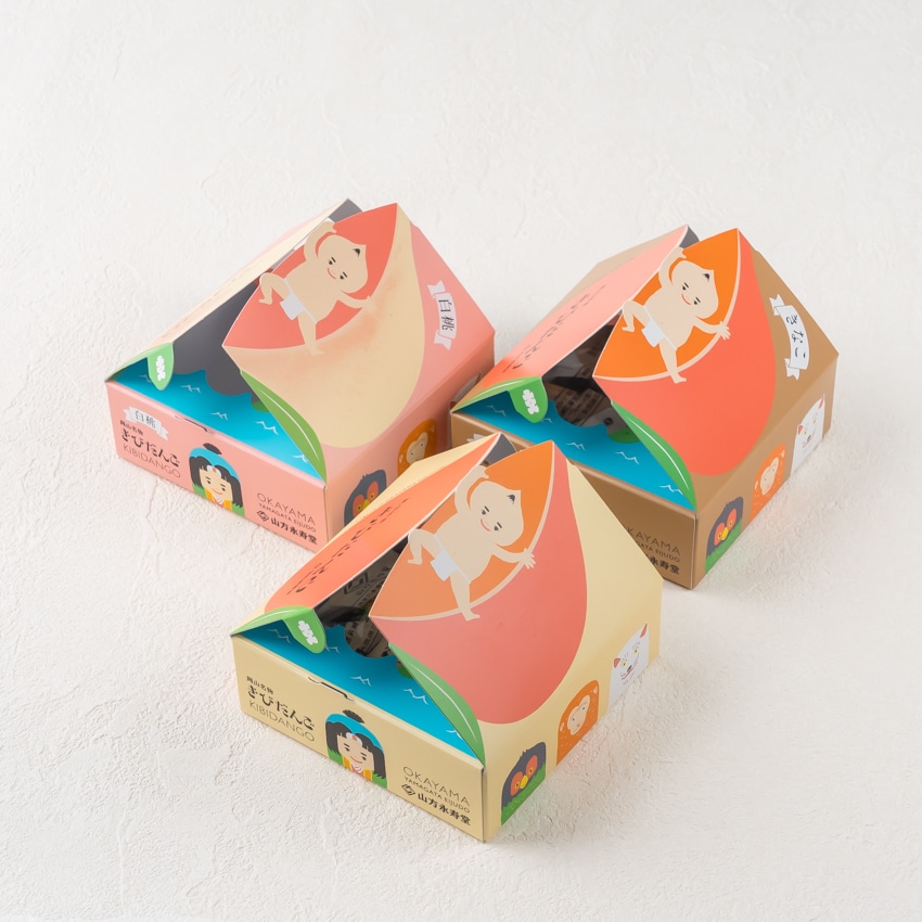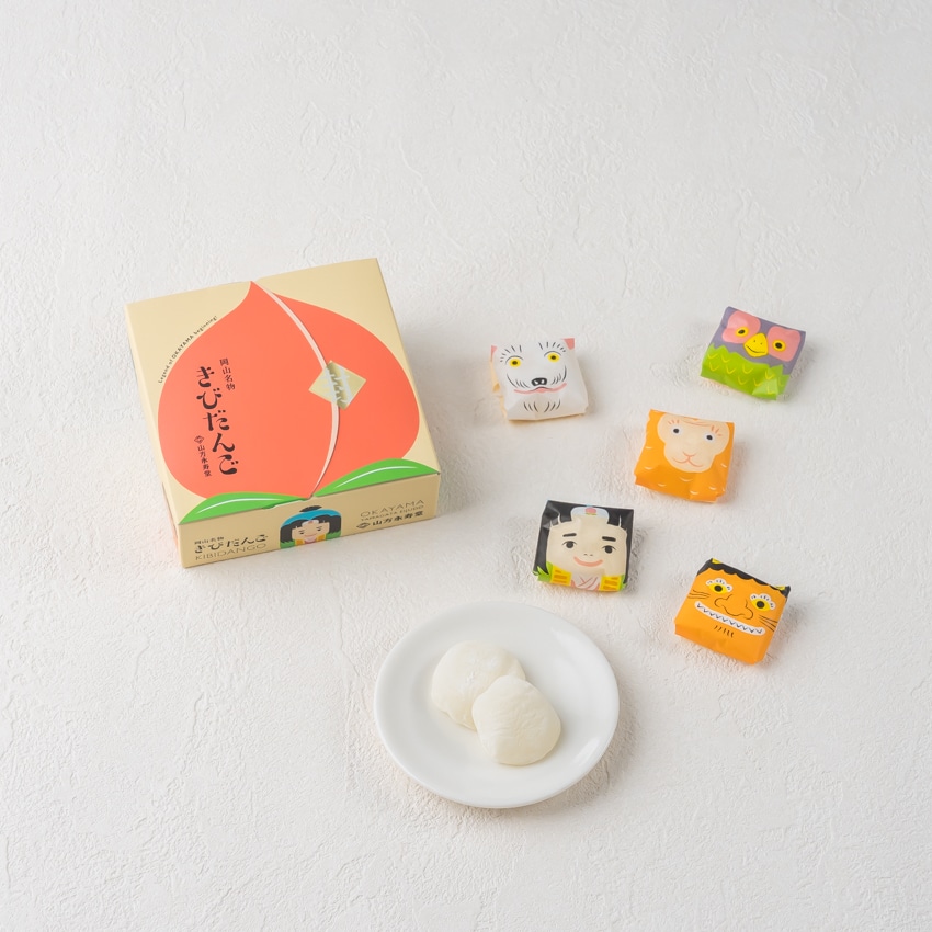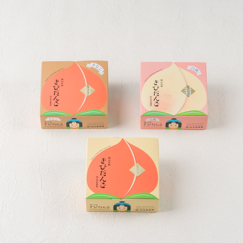 「開けて楽しい、食べておいしい」きびだんご。桃太郎、犬、猿、雉、鬼のかわいい包み紙のきびだんごは配りやすさも抜群です。桃の箱を開けると桃太郎物語のはじまりはじまり。伝統製法で長時間かけておつくりするきびだんごは上品な甘さに加え、滑らかな舌触りともちもち食感が特徴。昔ながらのシンプルなプレーン味、岡山県産きな粉を使用した香ばしいきなこ味、岡山県産白桃ピュレを使用した白桃の優しい甘さと香りが漂う上品な桃味、3種類の味をお楽しみいただける羽田空港限定アソートです。
