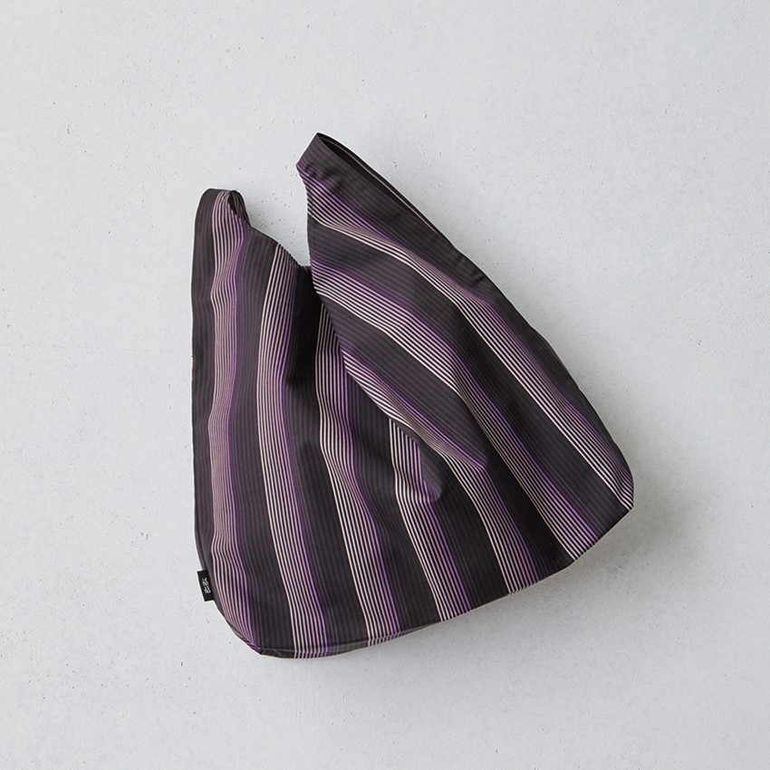 【商品説明文】たて縞が美しいシンプルバッグは、ものを入れて持つとコロンとした三角のフォルムに。持ち手が両端にあることで口が広くなり、ものを入れるのもスムーズです。コンパクトに折り畳め、ショッピングバッグとしても重宝します。